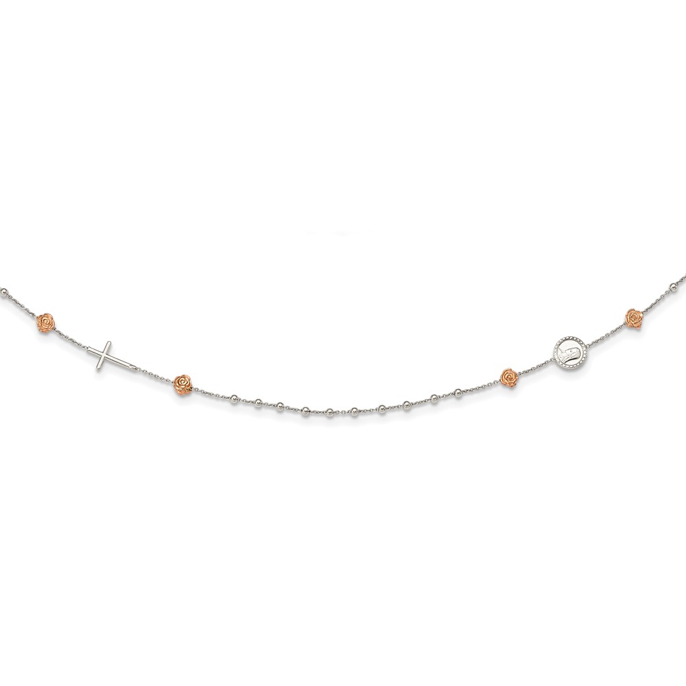 Sterling Silver Beaded with Rose-tone Roses Religious 18 inch Necklace with 1 inch extension