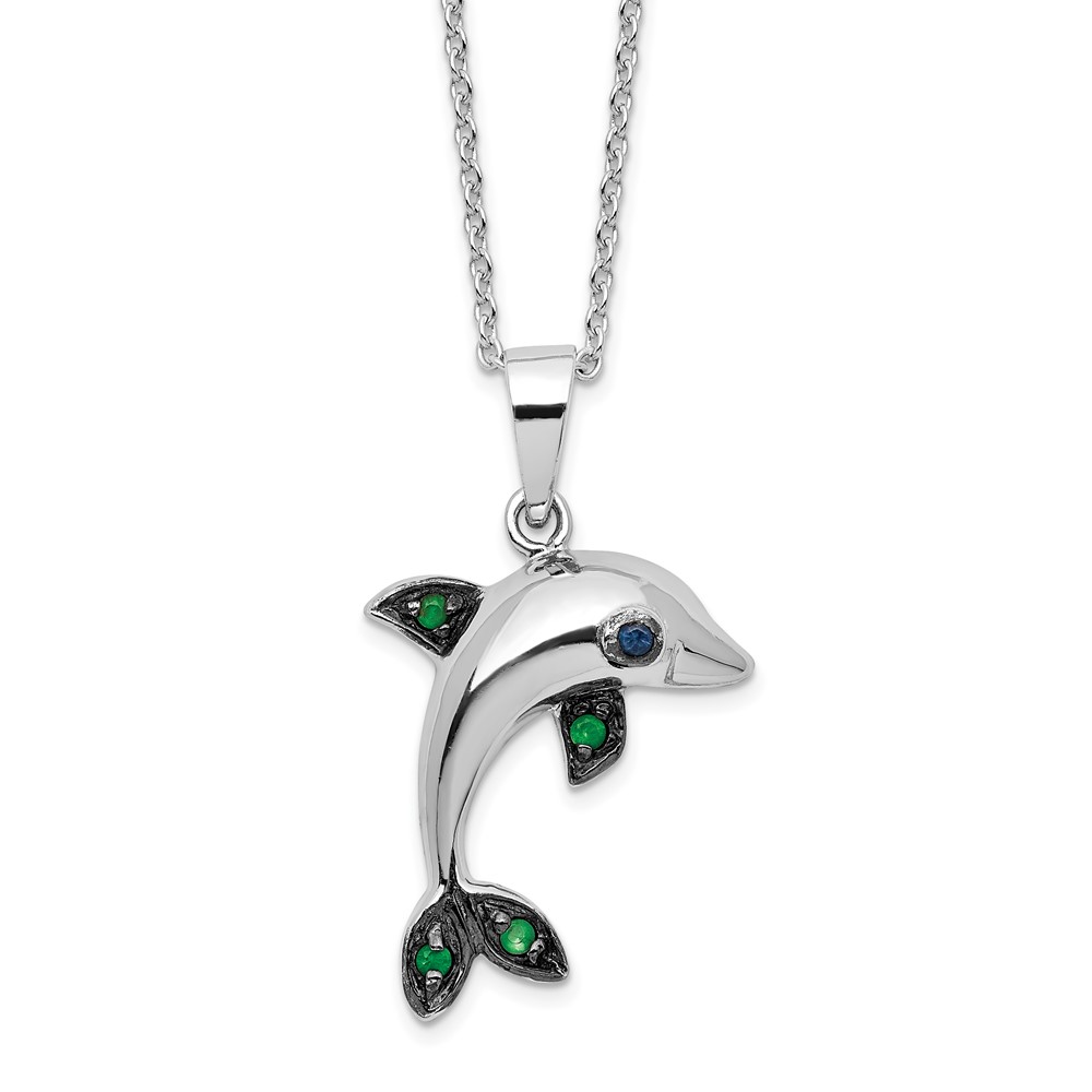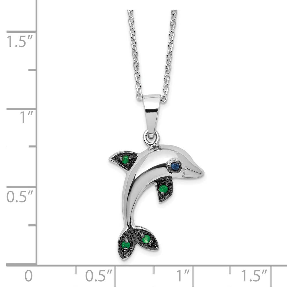 Sterling Silver Rhodium-plated Polished Blue and Green CZ Dolphin 16 Inch with 2 Inch Extension Necklace