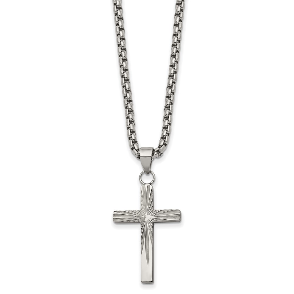 Chisel Stainless Steel Polished and Textured Sunburst Design Cross Pendant on a 24 inch Box Chain Necklace