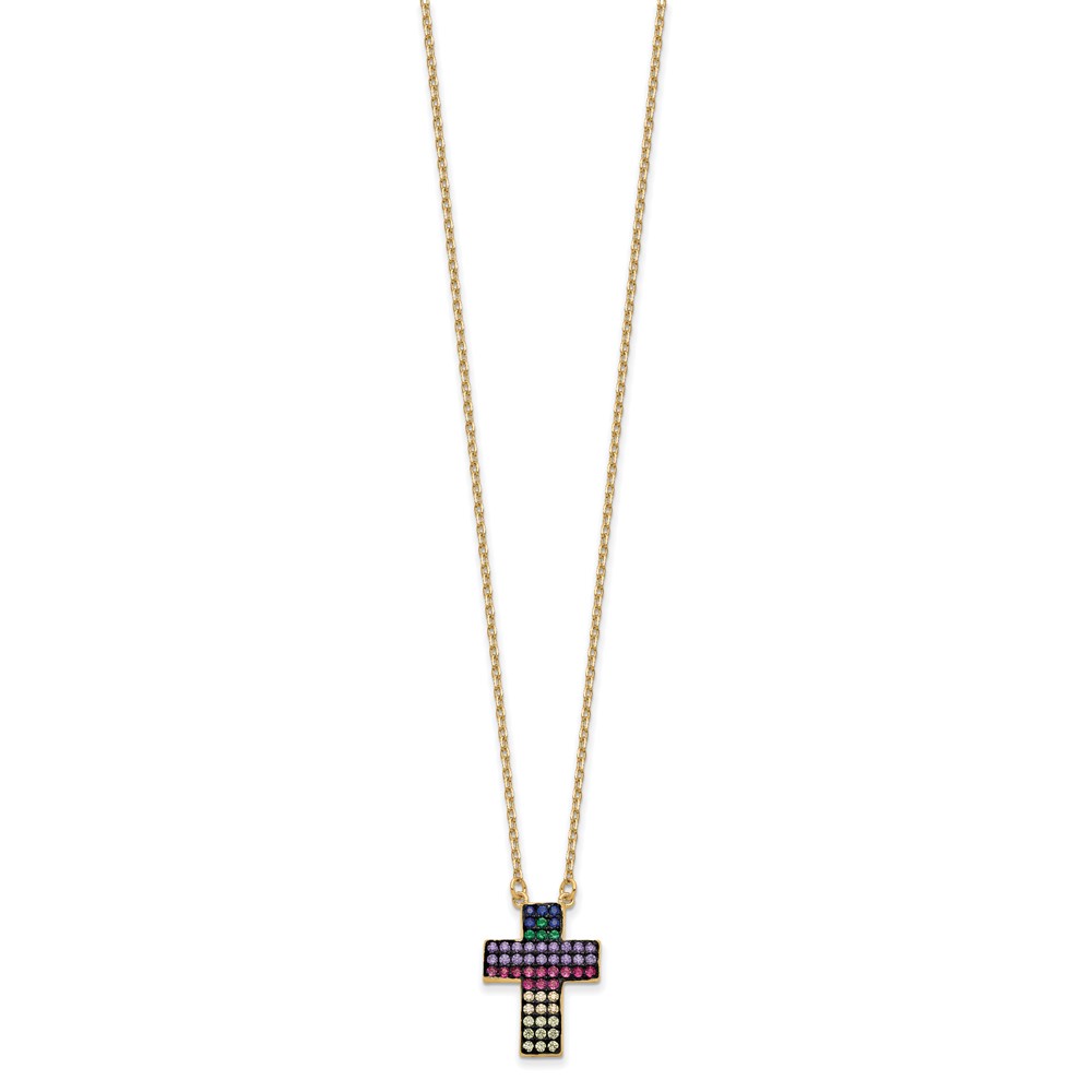 Prizma Sterling Silver Gold-tone 14K Flash Gold-plated 16 inch Colorful CZ Cross Necklace with 2 inch Extender