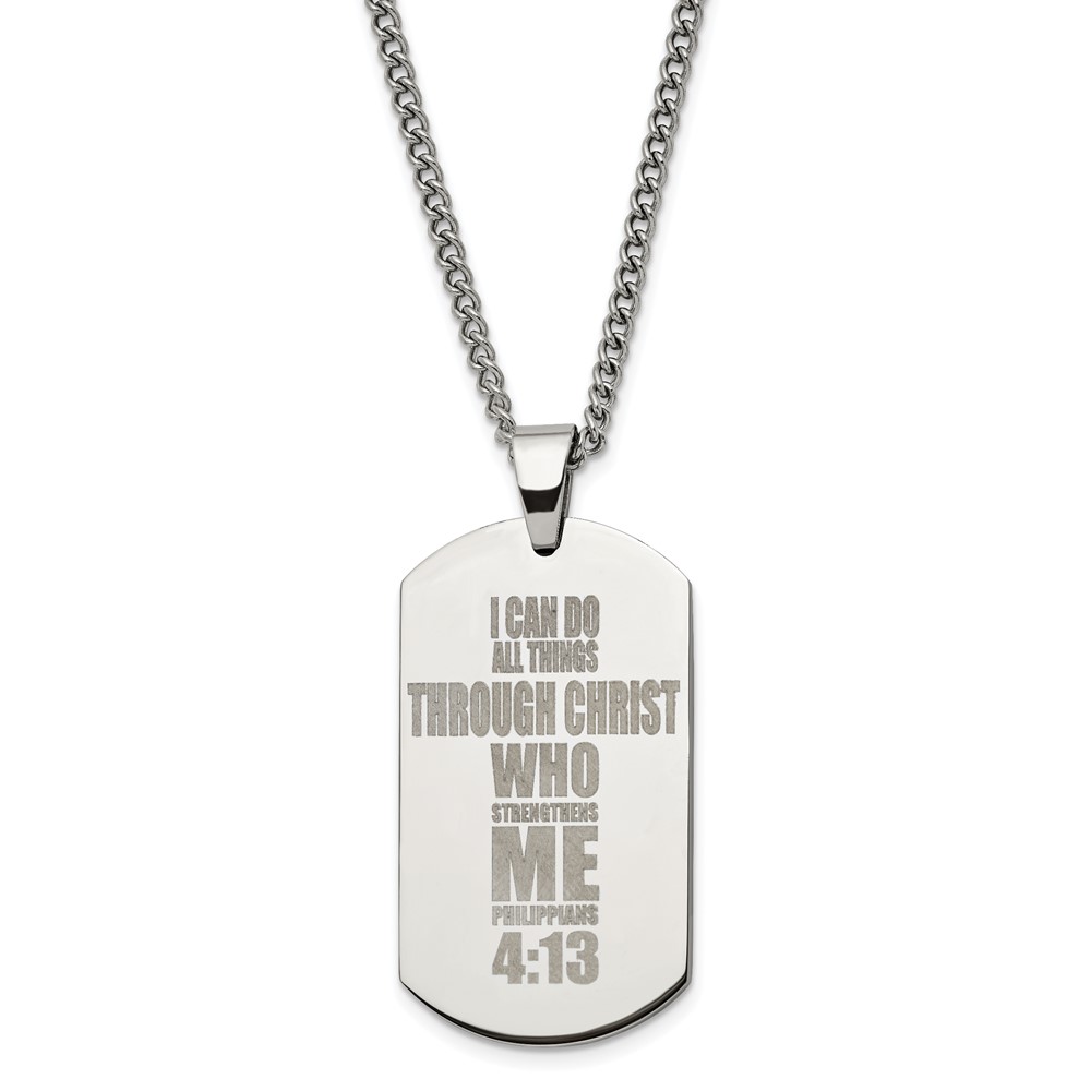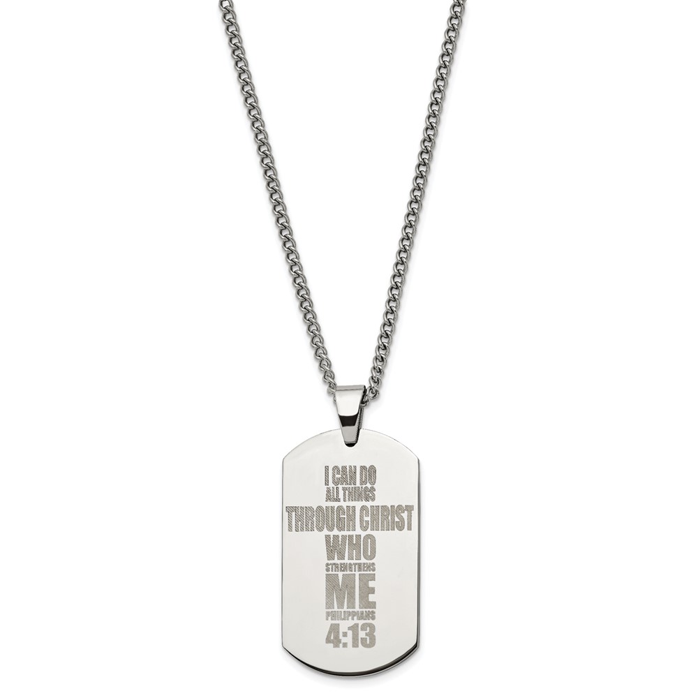 Chisel Stainless Steel Polished Lasered Philippians 4:13 Dog Tag on a 24 inch Curb Chain Necklace