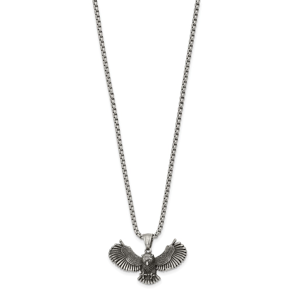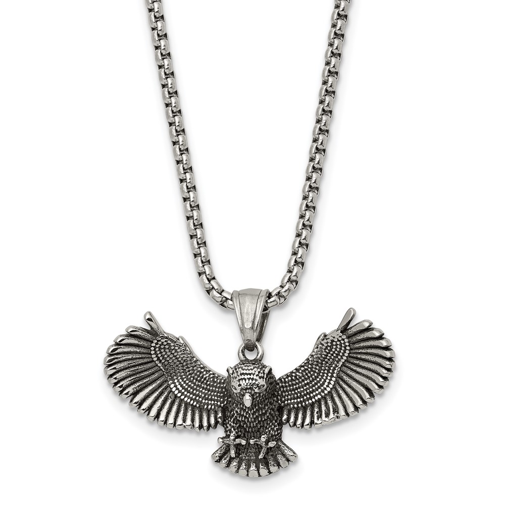 Chisel Stainless Steel Antiqued and Polished Flying Owl Pendant on a 24 inch Box Chain Necklace