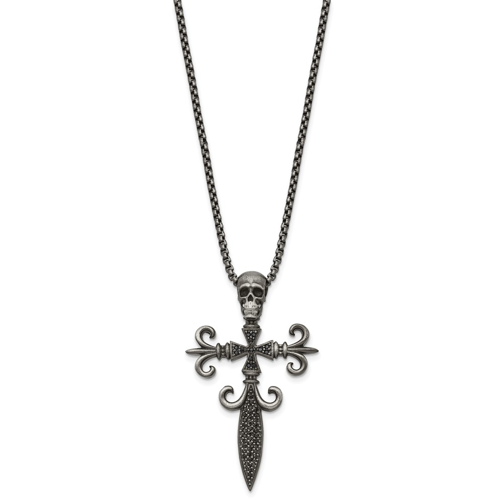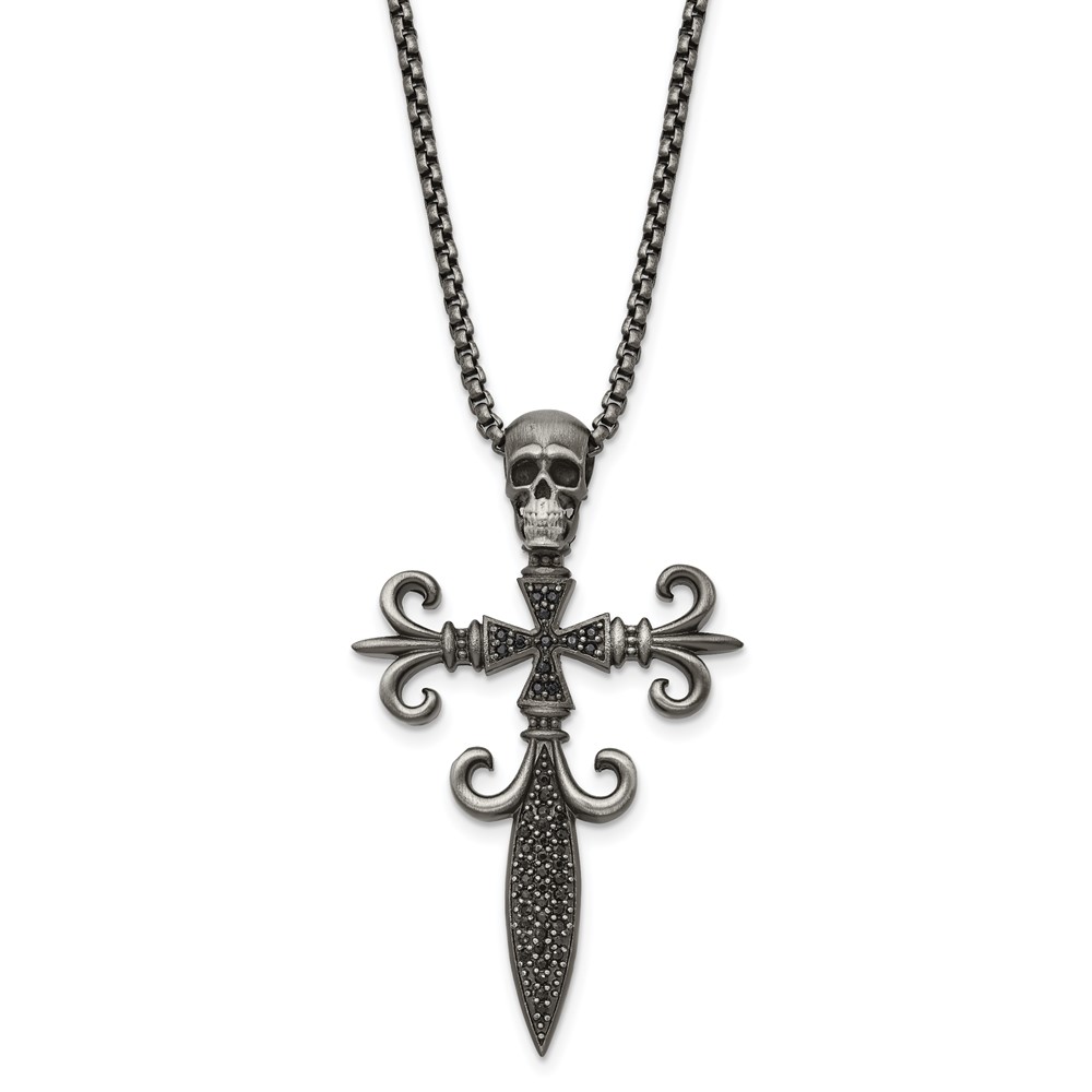 Chisel Stainless Steel Antique White Bronze-plated with CZ Cross and Skull Pendant on a 24 inch Box Chain Necklace