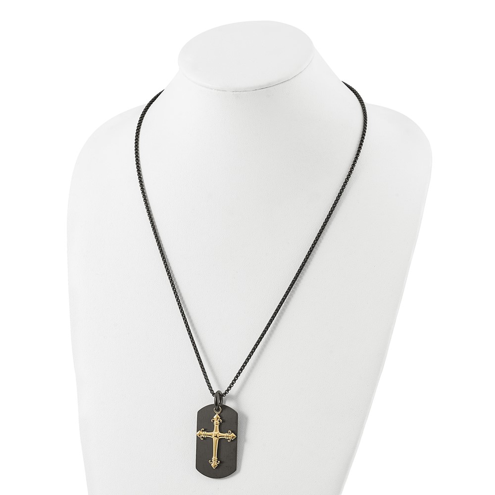 Chisel Stainless Steel Polished Black and Yellow IP-plated 2 Piece Cross and Dog Tag on a 24.75 inch Box Chain Necklace