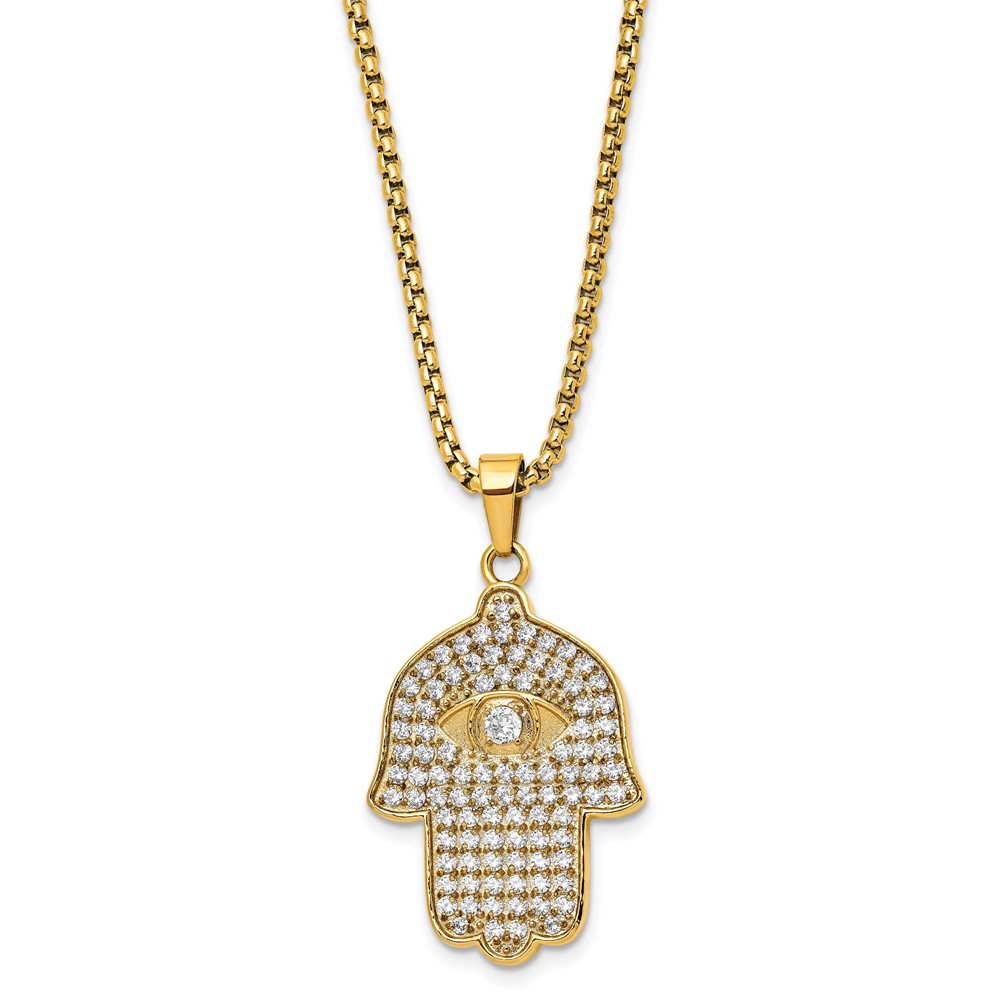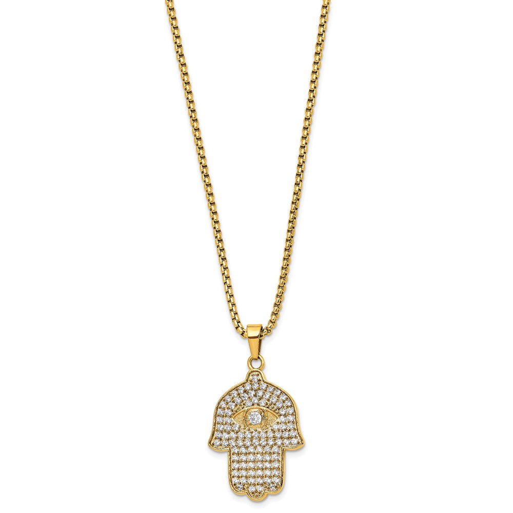 Chisel Stainless Steel Polished Yellow IP-plated with CZ Hamsa Pendant on a 24 inch Box Chain Necklace