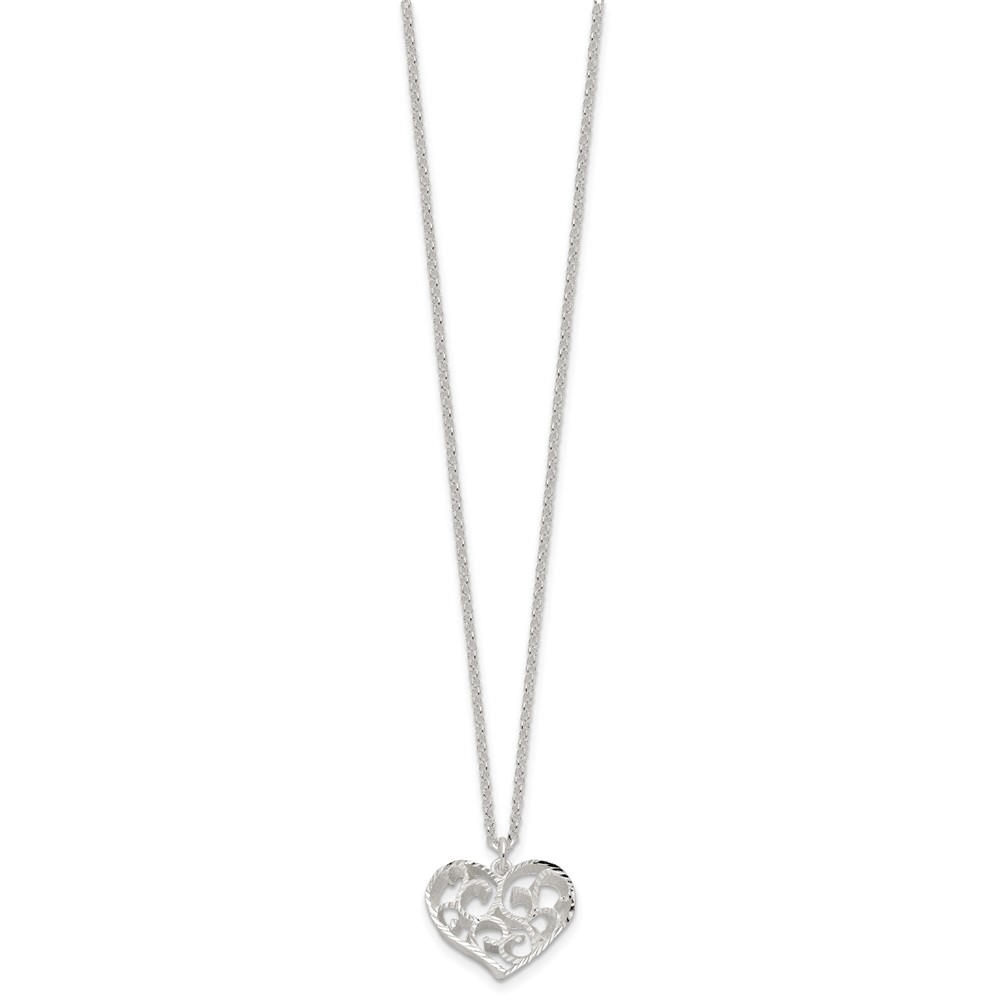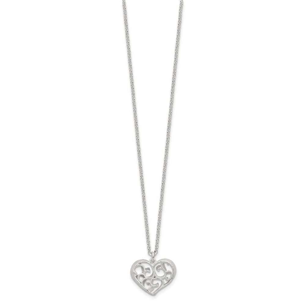 Sterling Silver RH-pltd Brushed D/C Filigree Heart w/2 in ext Necklace