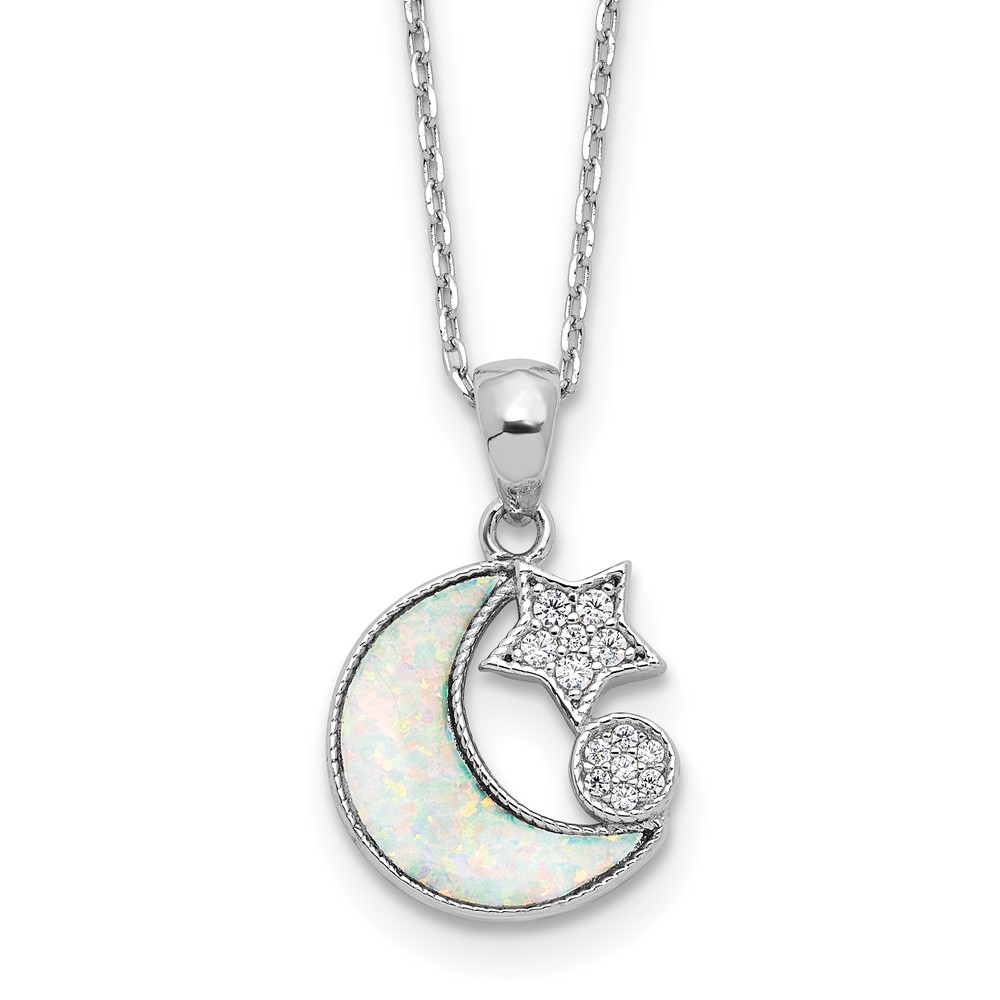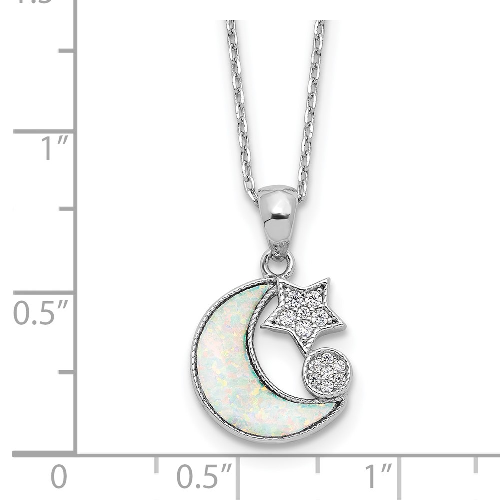 Sterling Silver RH-plated CZ Created Opal Inlay Moon w/2in ext Necklace