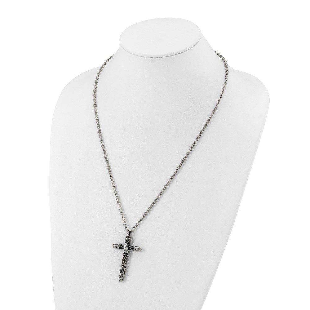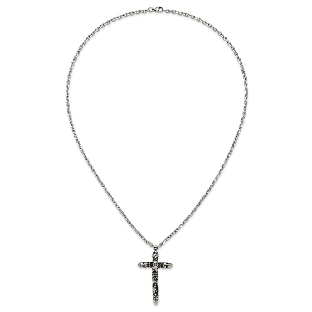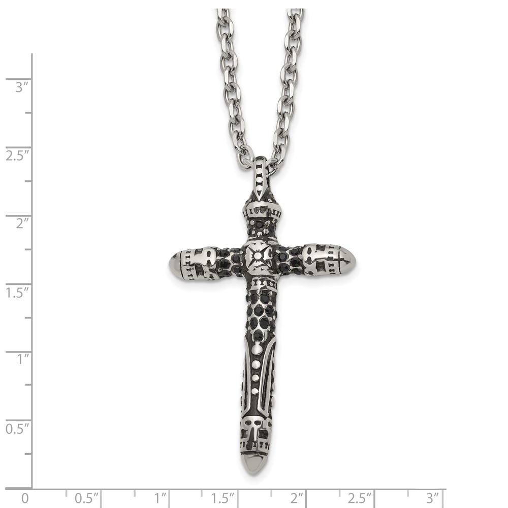 Chisel Stainless Steel Antiqued and Polished with Black Crystal Large Cross Pendant on a 24 inch Cable Chain Necklace