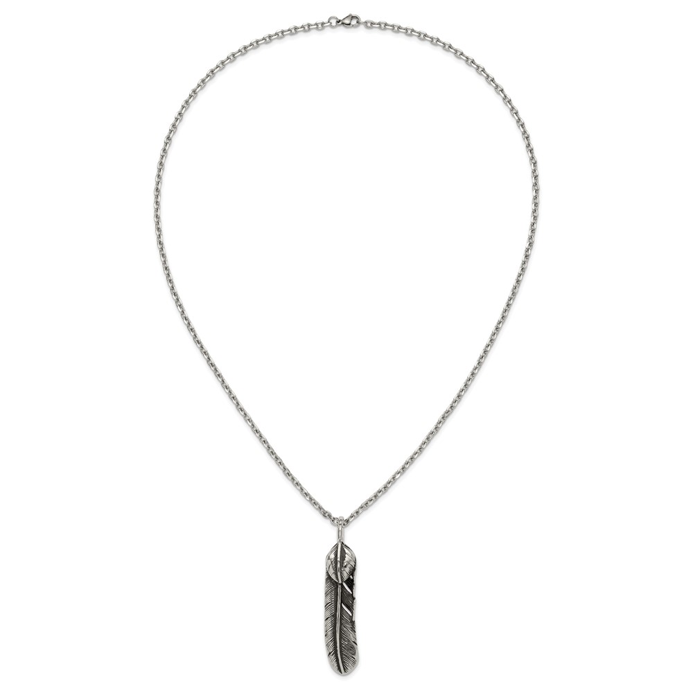 Chisel Stainless Steel Antiqued and Polished Feather Pendant on a 24 inch Cable Chain Necklace