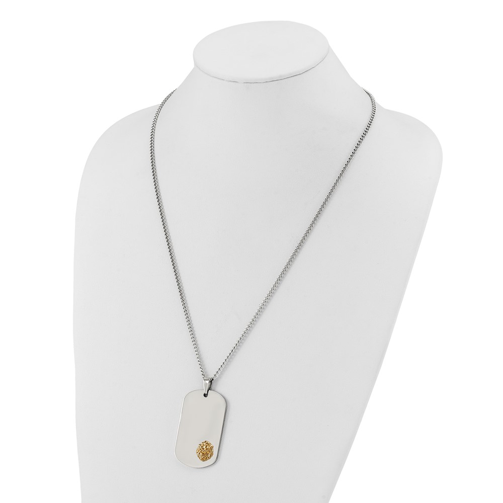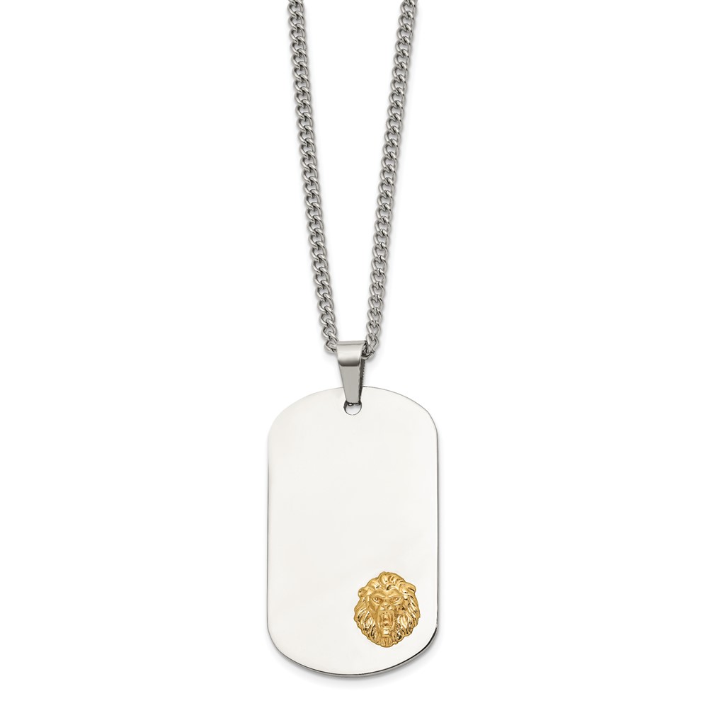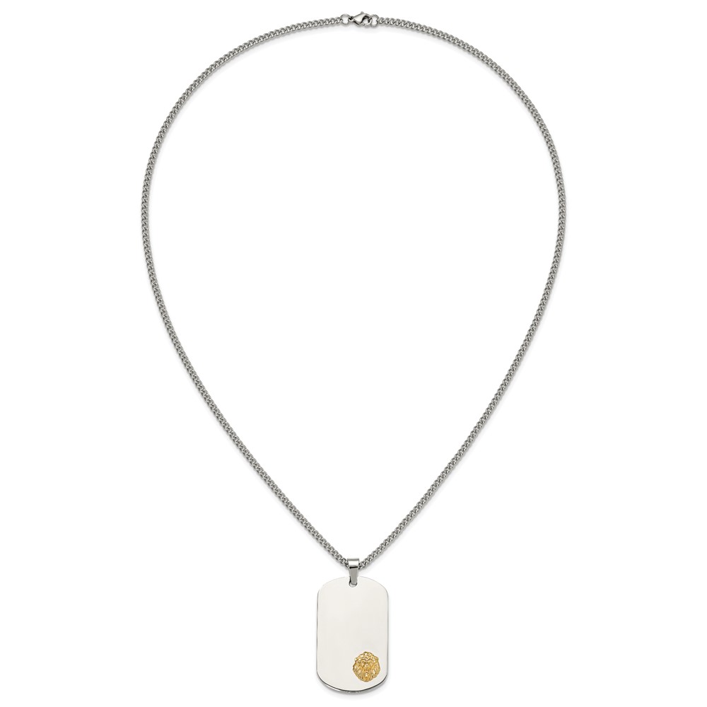 Chisel Stainless Steel Polished with 14K Gold Accent Lion Head Dog Tag on a 24 inch Curb Chain Necklace
