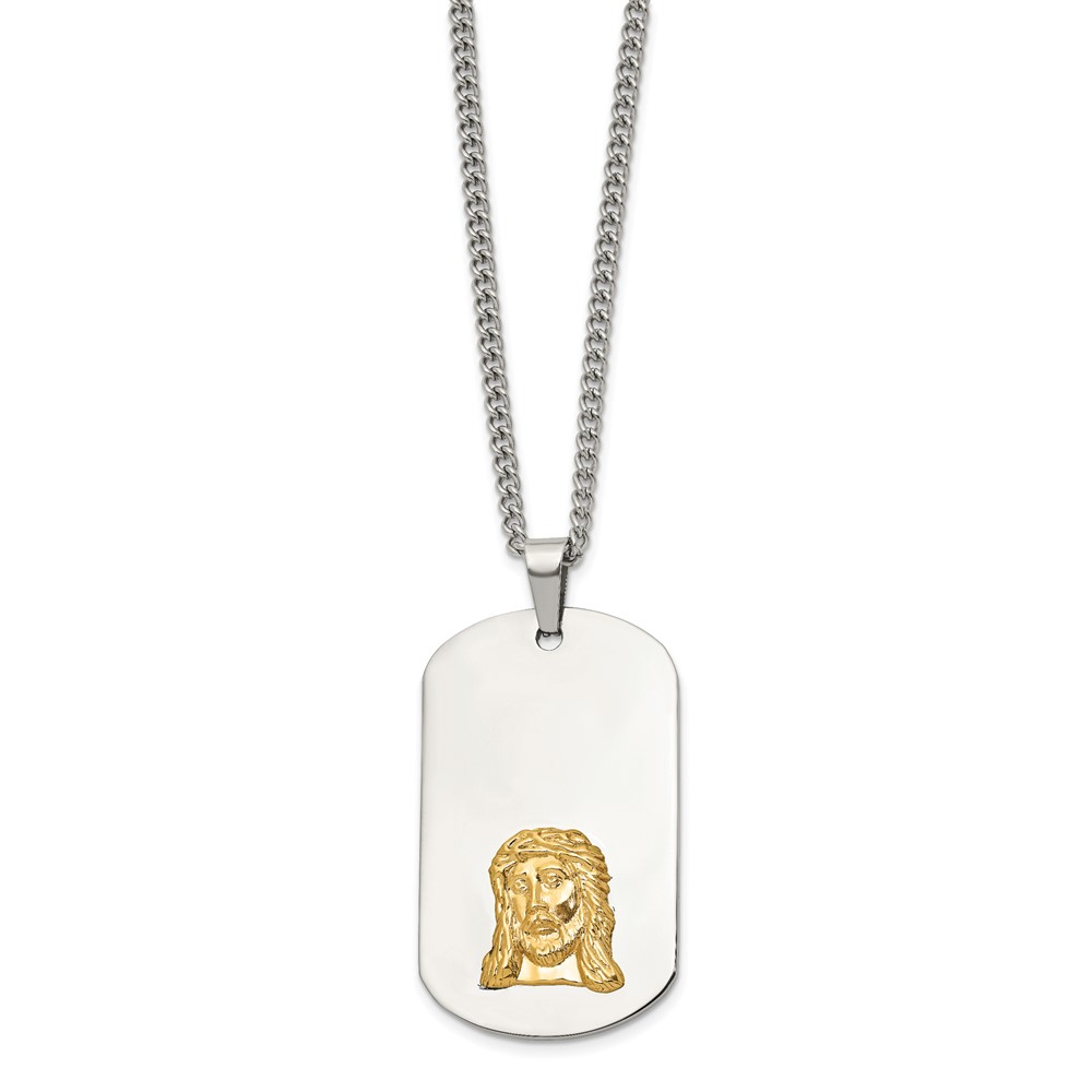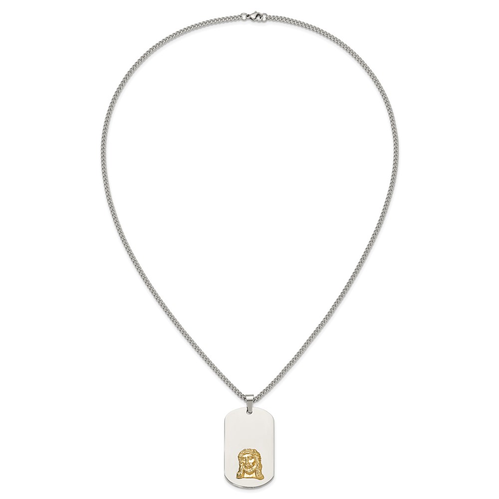 Chisel Stainless Steel Polished with 10K Gold Accent Jesus Face Dog Tag on a 24 inch Curb Chain Necklace