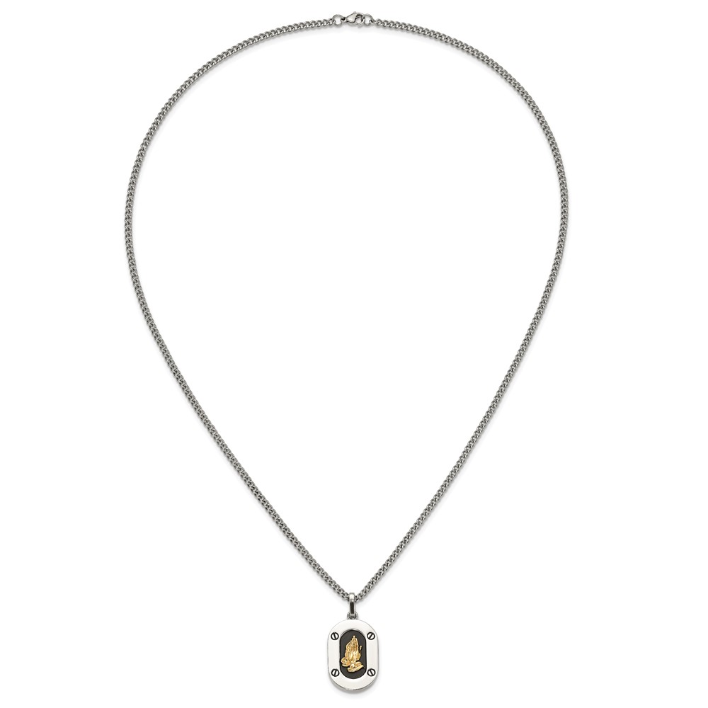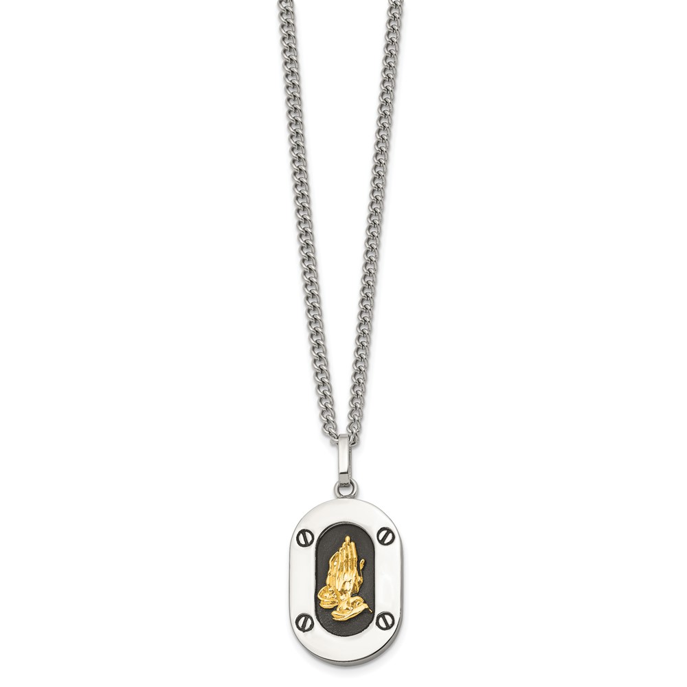 Chisel Stainless Steel Polished with 14K Gold Accent Praying Hands with Black Enamel Pendant on a 24 inch Curb Chain Necklace