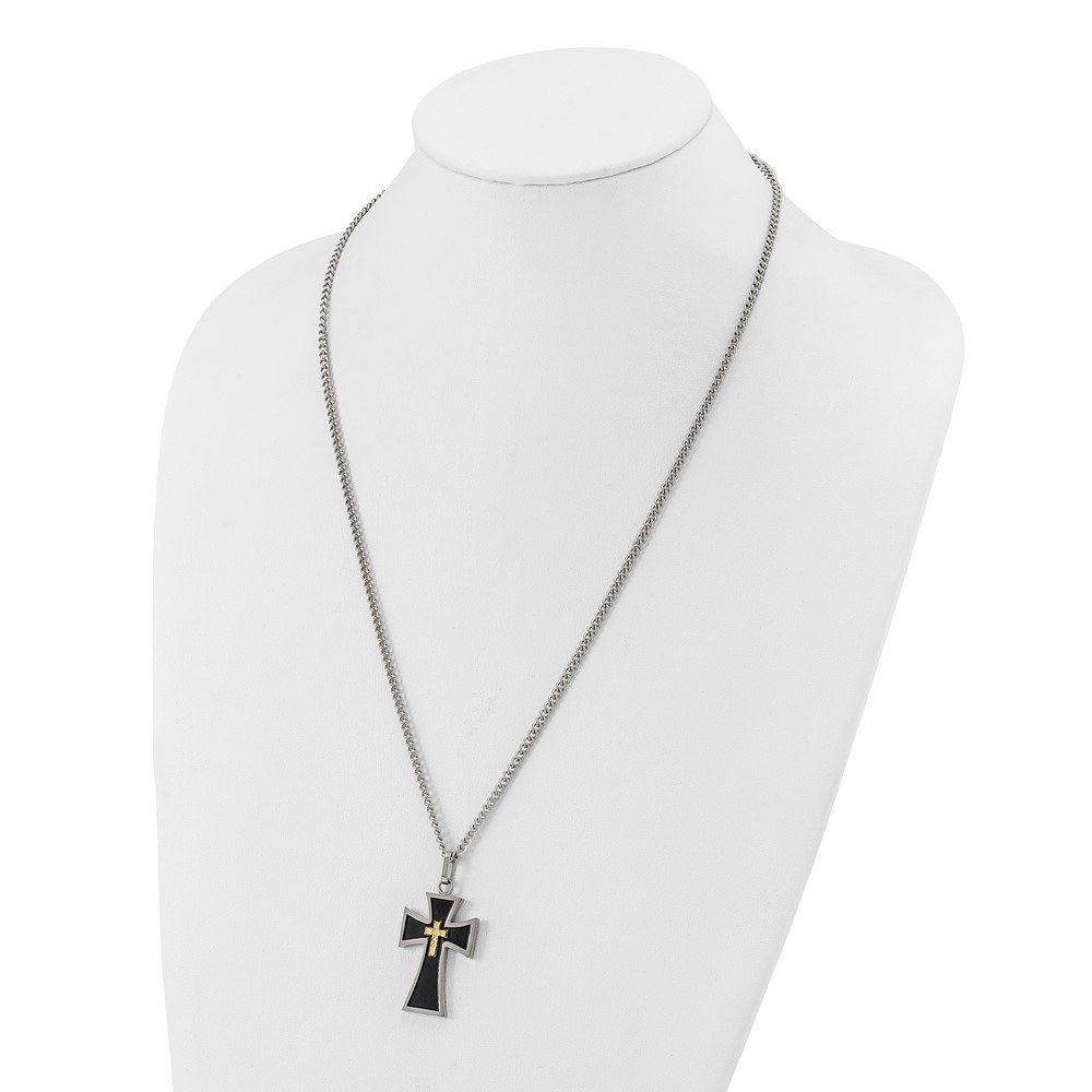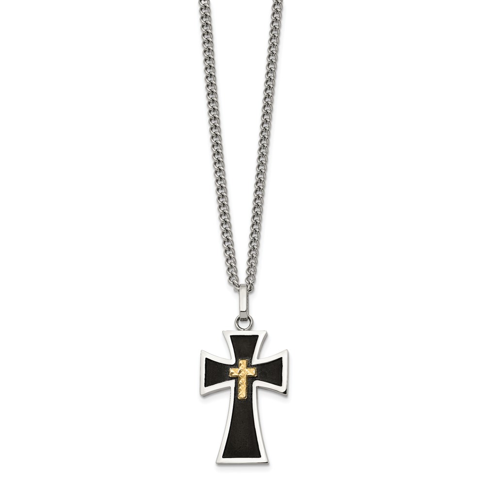 Chisel Stainless Steel Polished with Diamond-cut 14K Gold Accent with Black Enamel Cross Pendant on a 24 inch Curb Chain Necklace