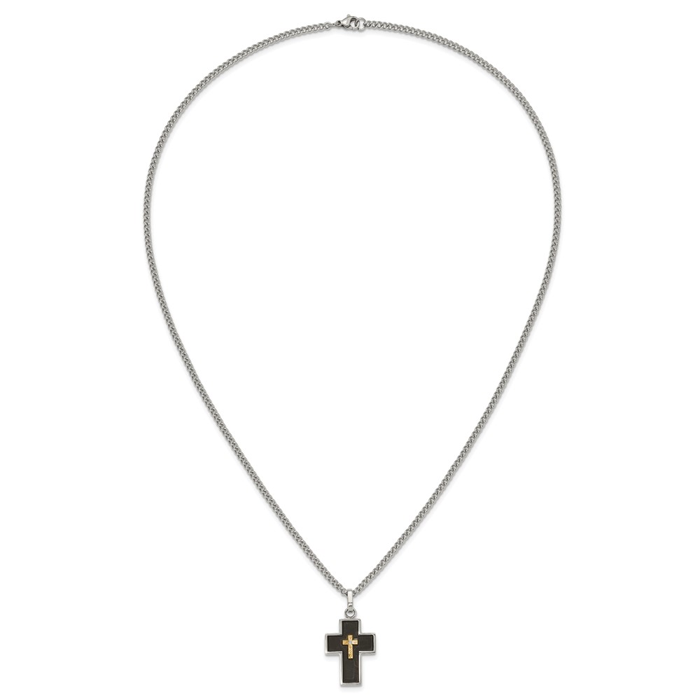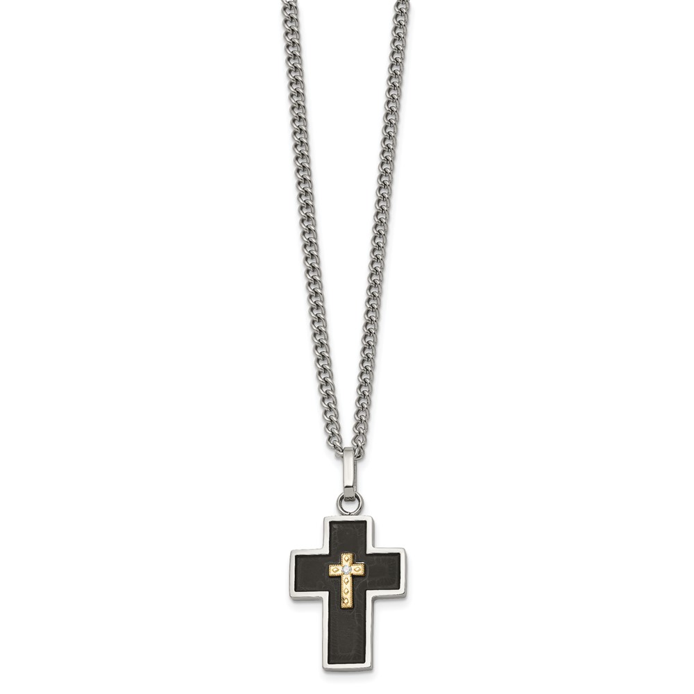 Chisel Stainless Steel Polished with 14K Gold Accent and 2pt. Diamond with Black Enamel Cross Pendant on 24 inch Curb Chain Necklace