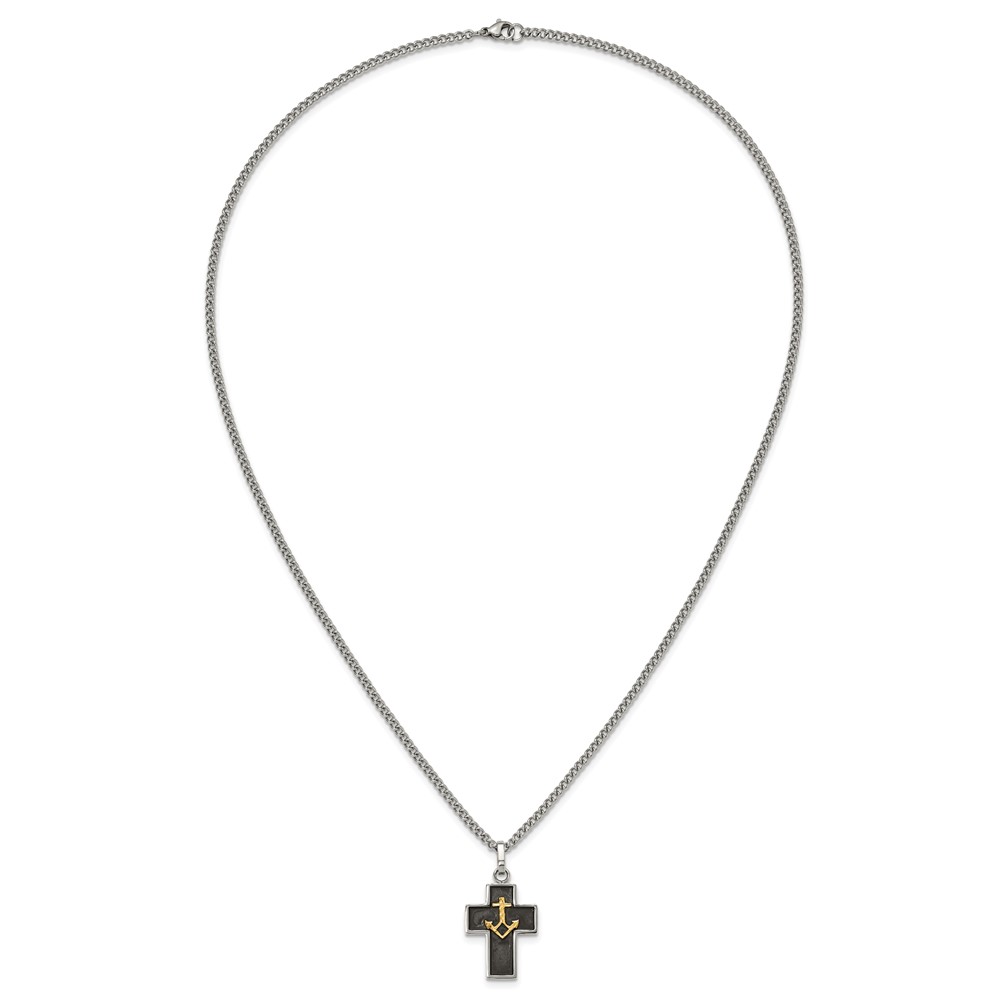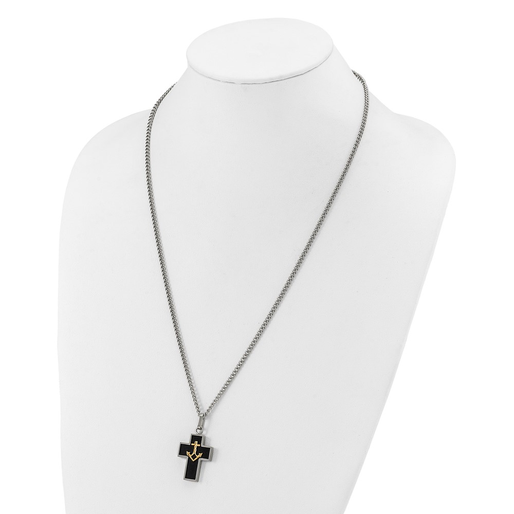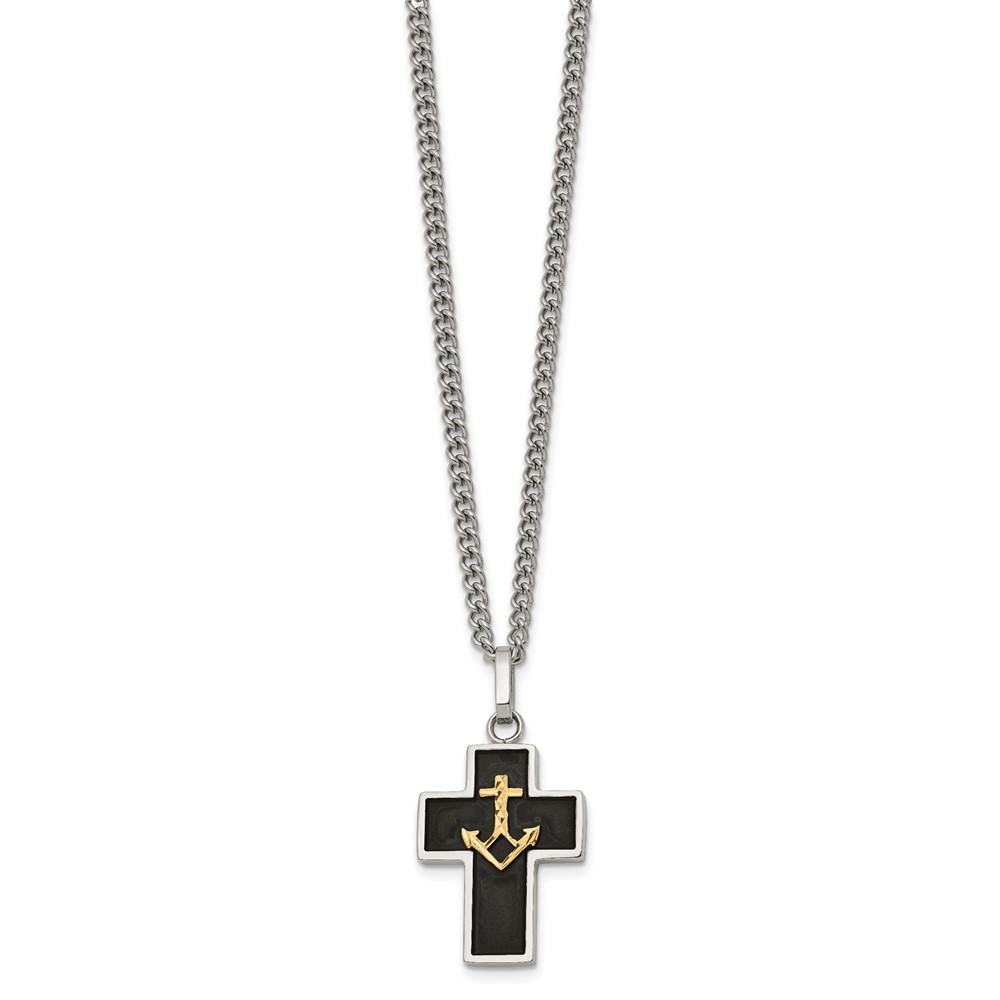Chisel Stainless Steel Polished with Diamond-cut 14K Gold Accent with Black Enamel Cross and Anchor Pendant on a 24 inch Necklace