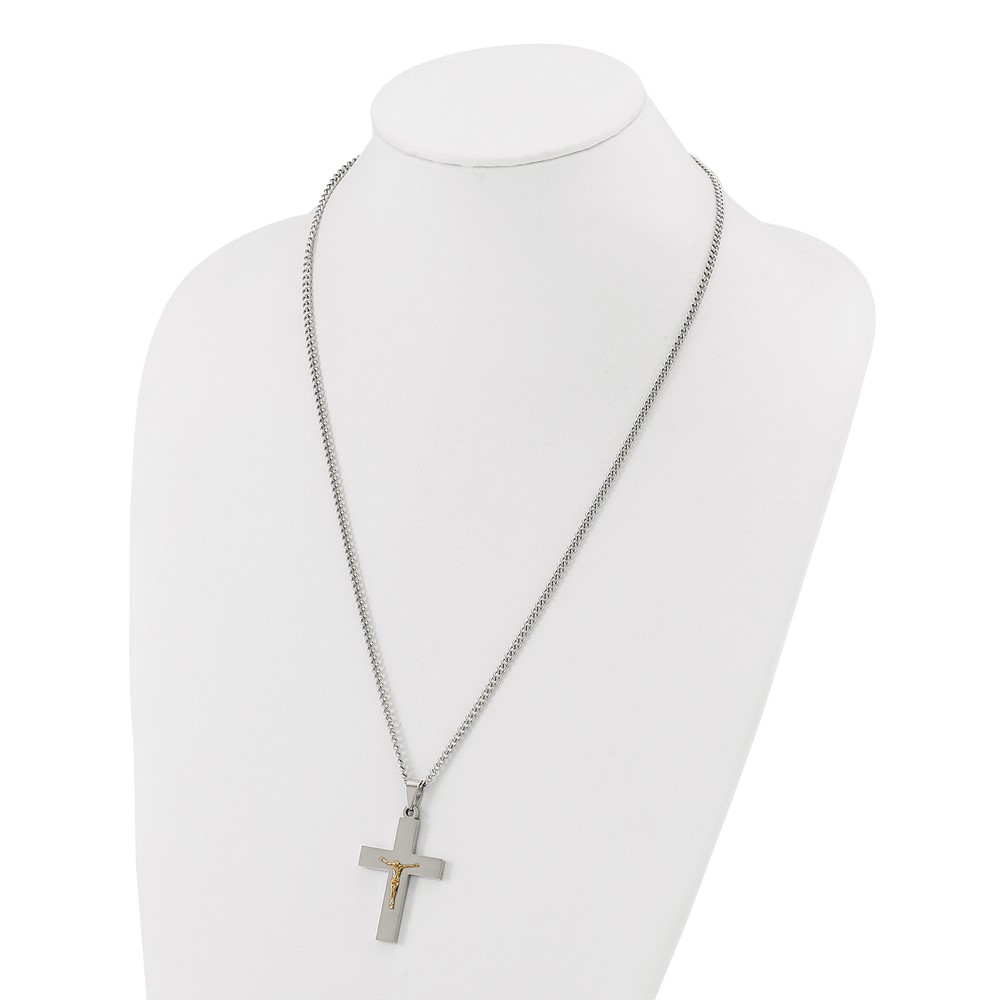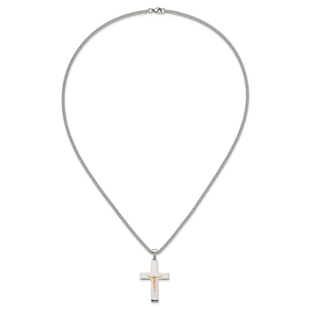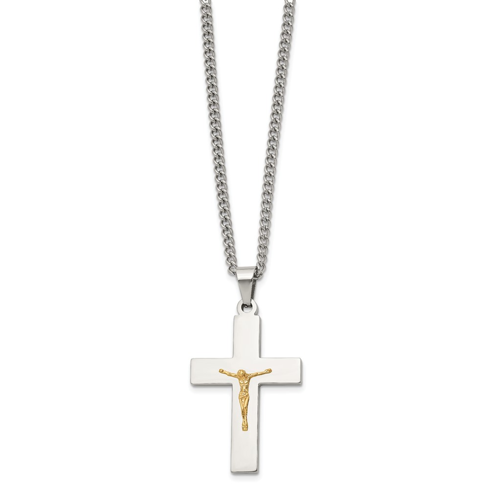 Chisel Stainless Steel Polished with 14K Gold Accent Crucifix Pendant on a 24 inch Curb Chain Necklace