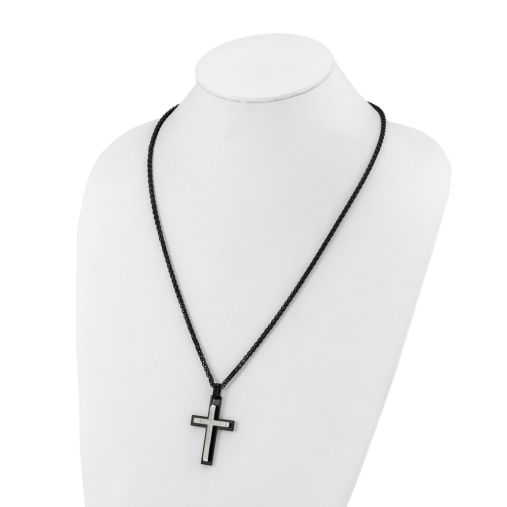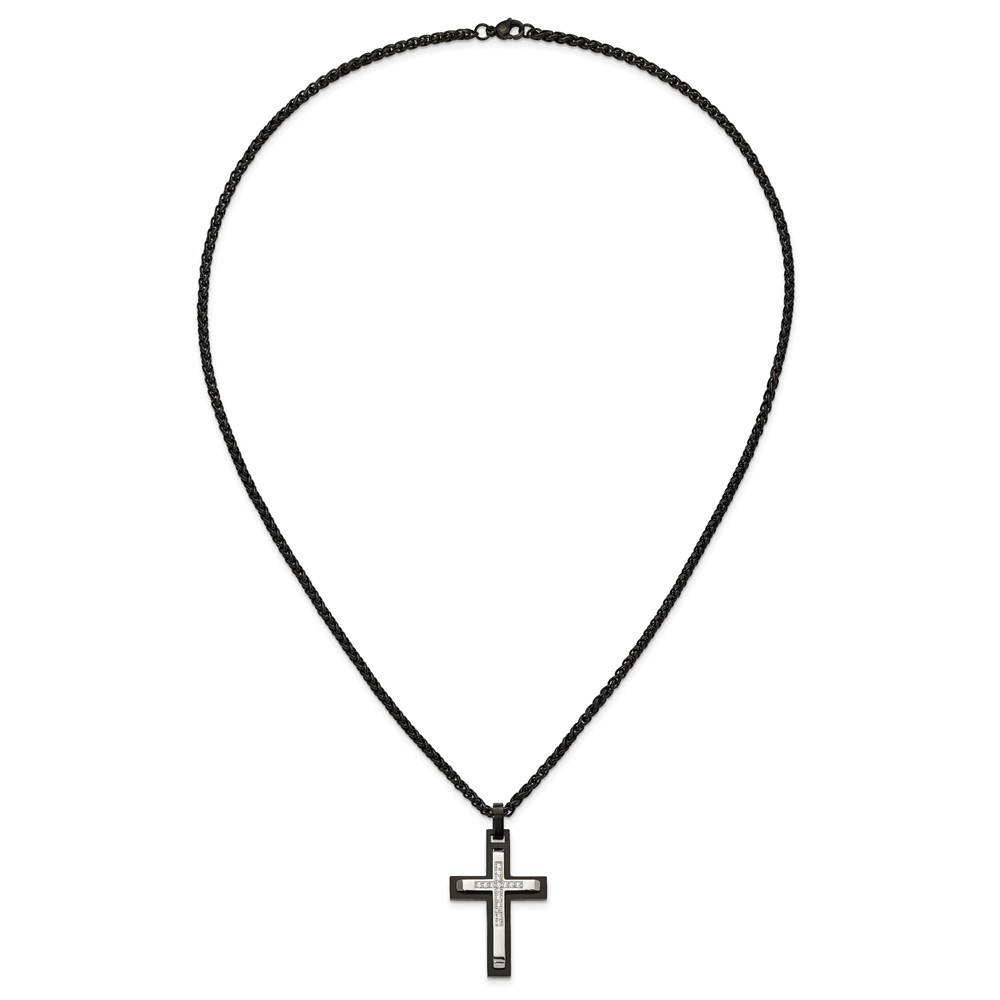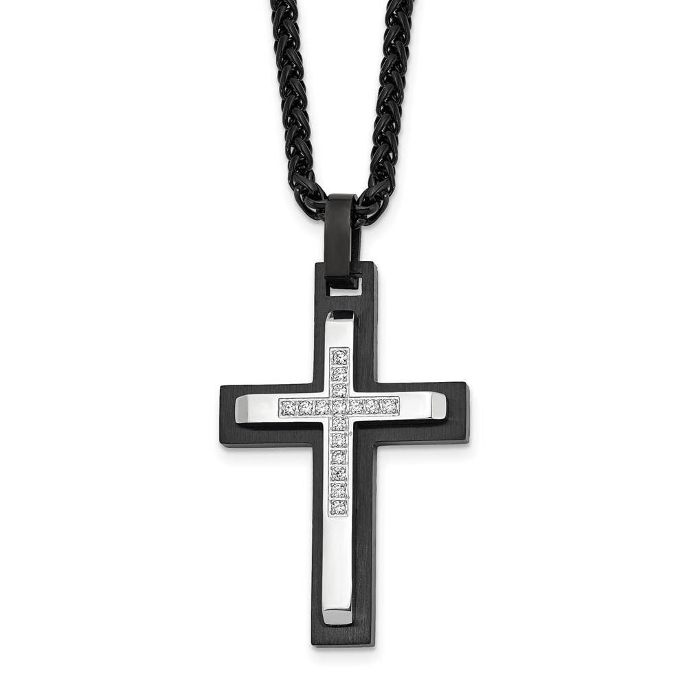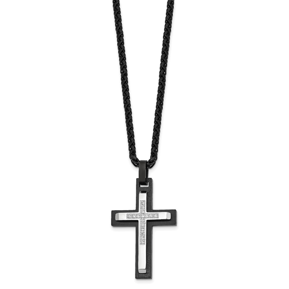 Chisel Stainless Steel Brushed and Polished Black IP-plated with CZ Cross Pendant on a 24 inch Wheat Chain Necklace