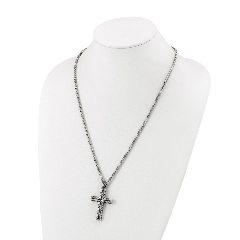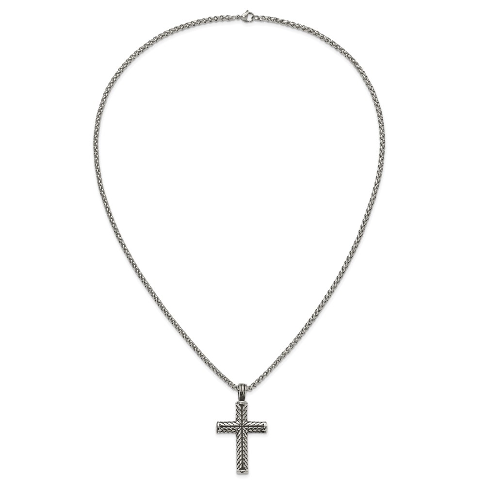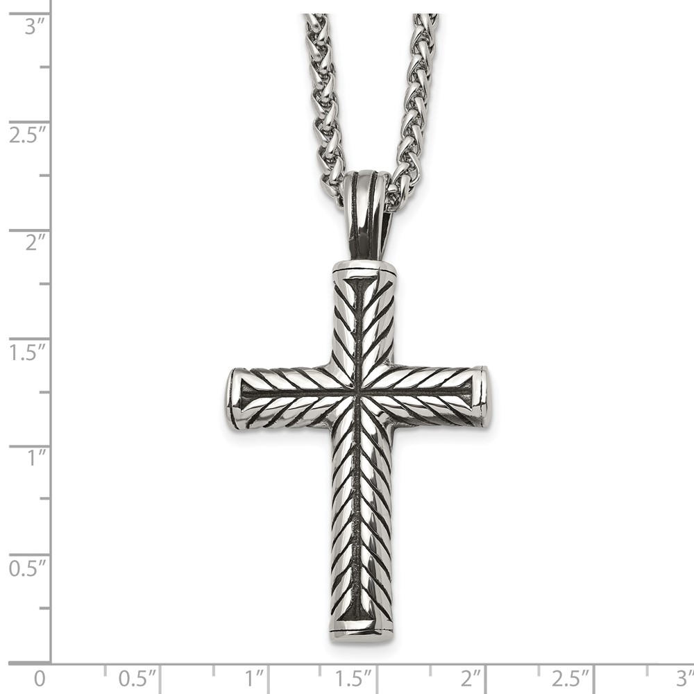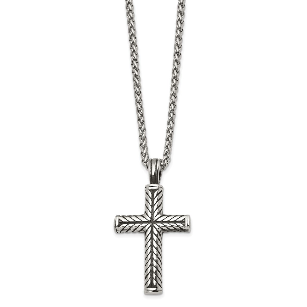 Chisel Stainless Steel Antiqued and Polished Cross Pendant on a 24 inch Wheat Chain Necklace