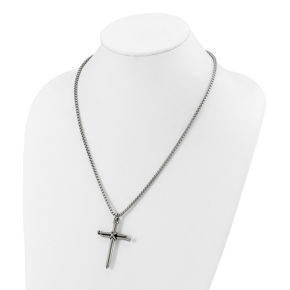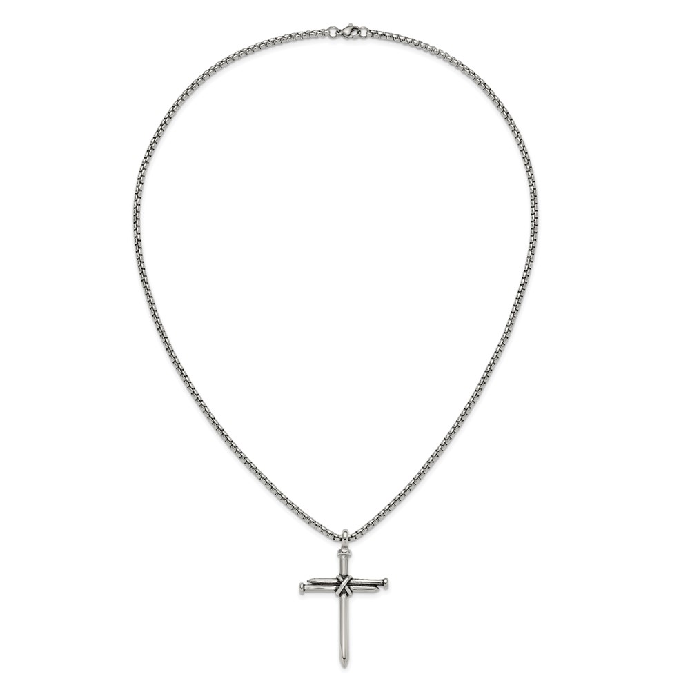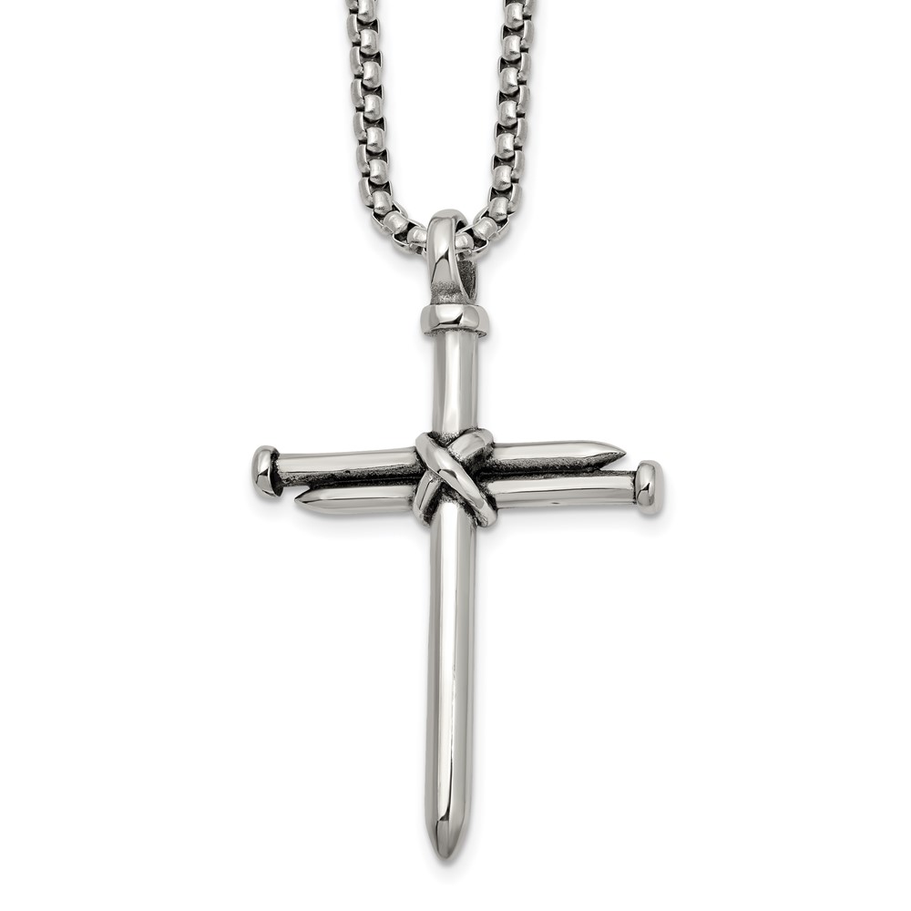 Chisel Stainless Steel Polished Antiqued and Polished Cross of Nails Pendant on a 22 inch Box Chain Necklace