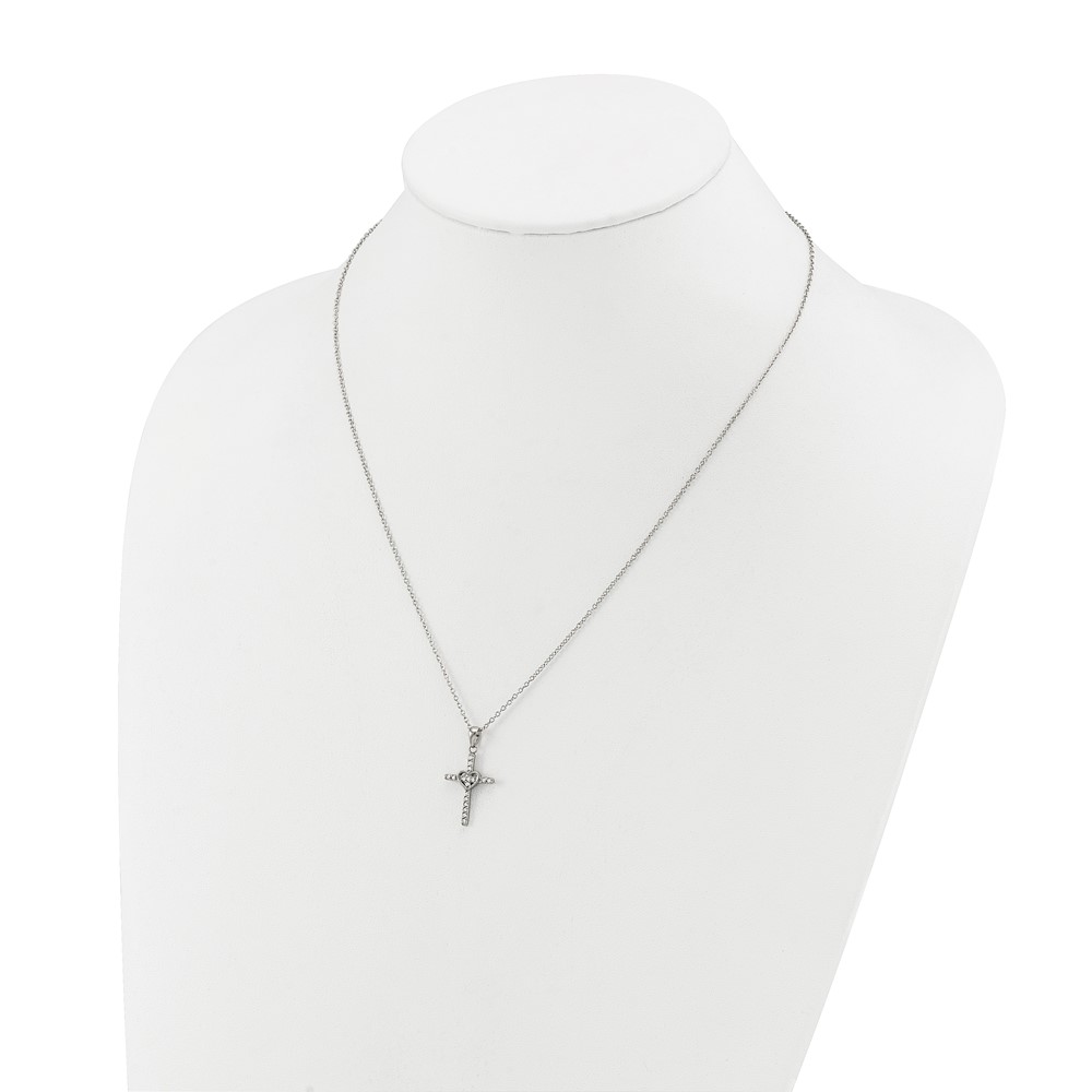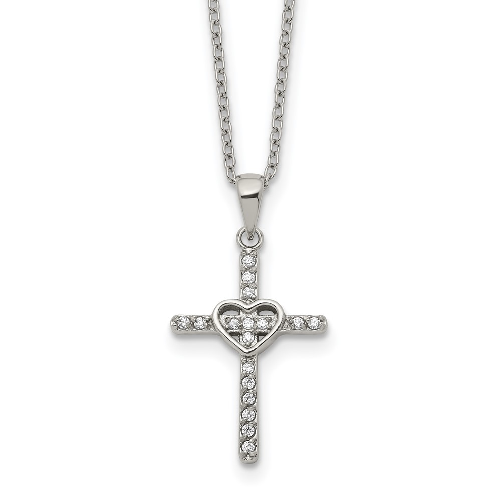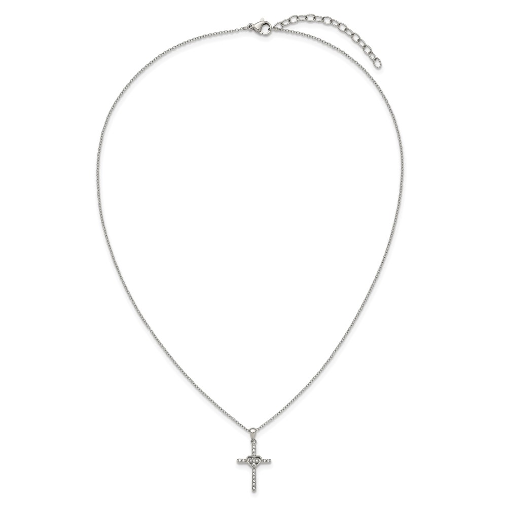 Chisel Stainless Steel Polished with CZ Cross with Heart Pendant on an 18 inch Plus 2 inch Extension Cable Chain Necklace