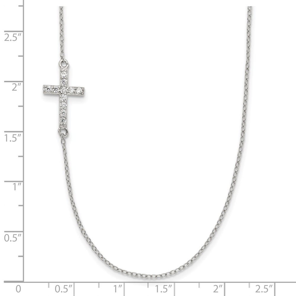Sterling Silver Rhod-pltd CZ Offset Sideways Cross w/2in Ext Necklace