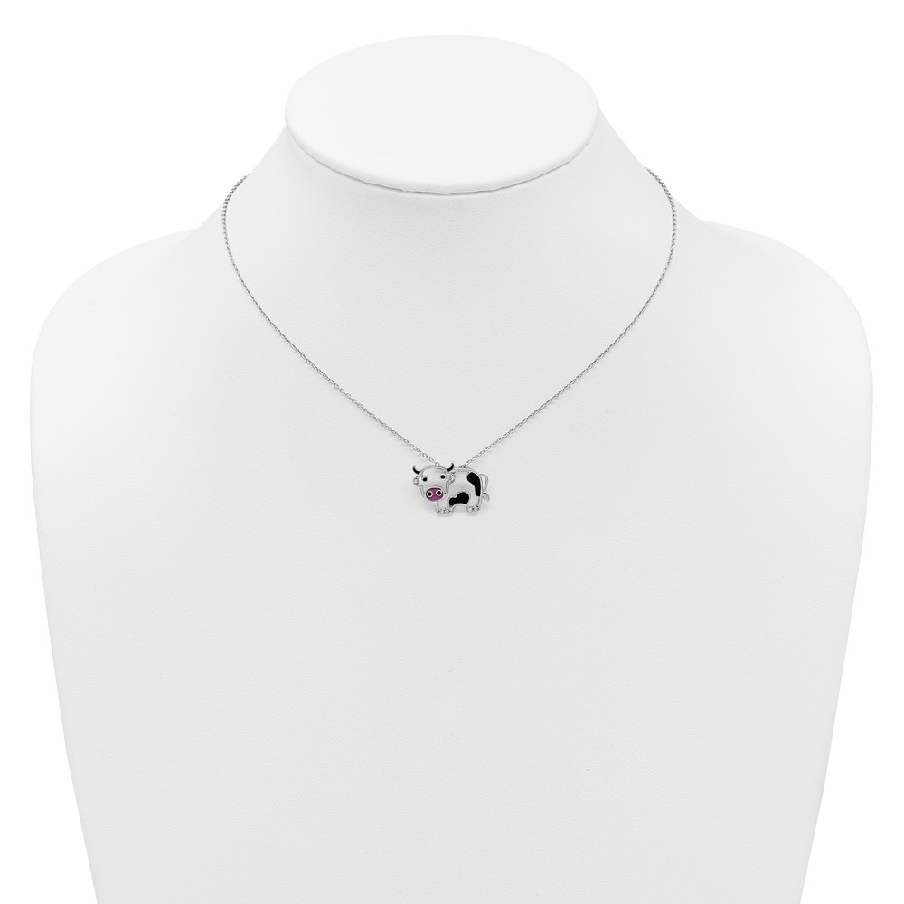 Cheryl M Sterling Silver Rhodium-plated Polished and Enameled Black and White CZ Cow 16 Inch with 2 Inch Extension Necklace