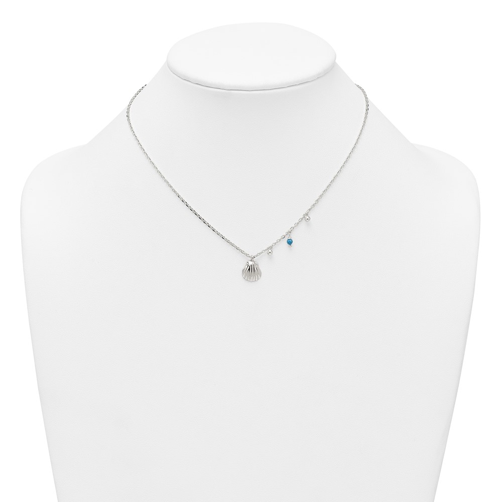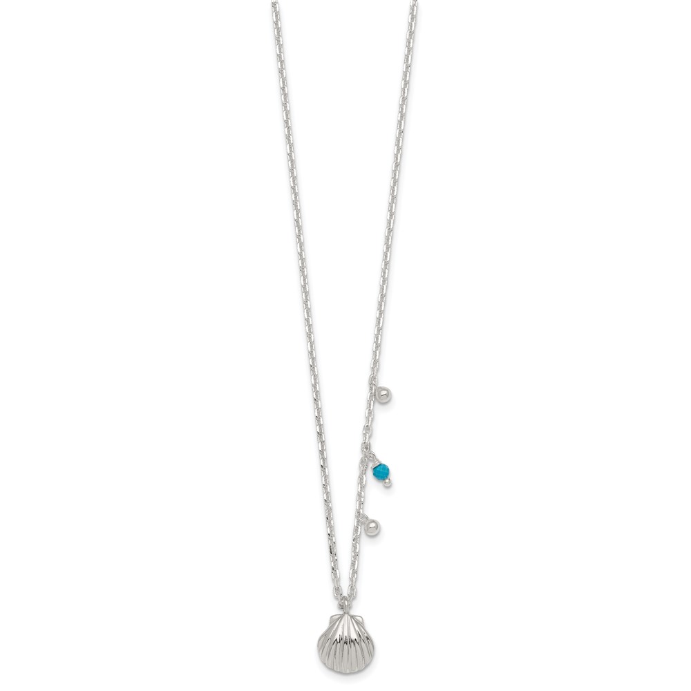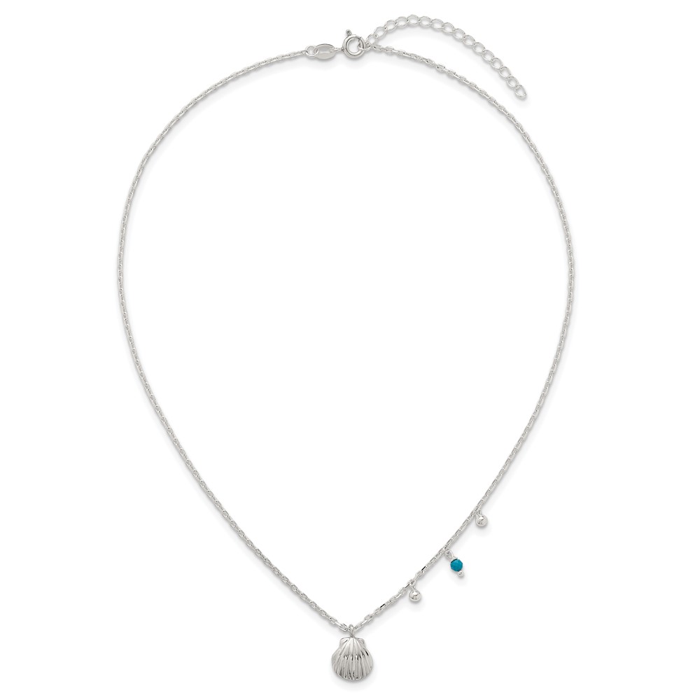 Sterling Silver Polished Beaded Turquoise and Grooved Seashell 16 inch with 2 inch Extension Necklace
