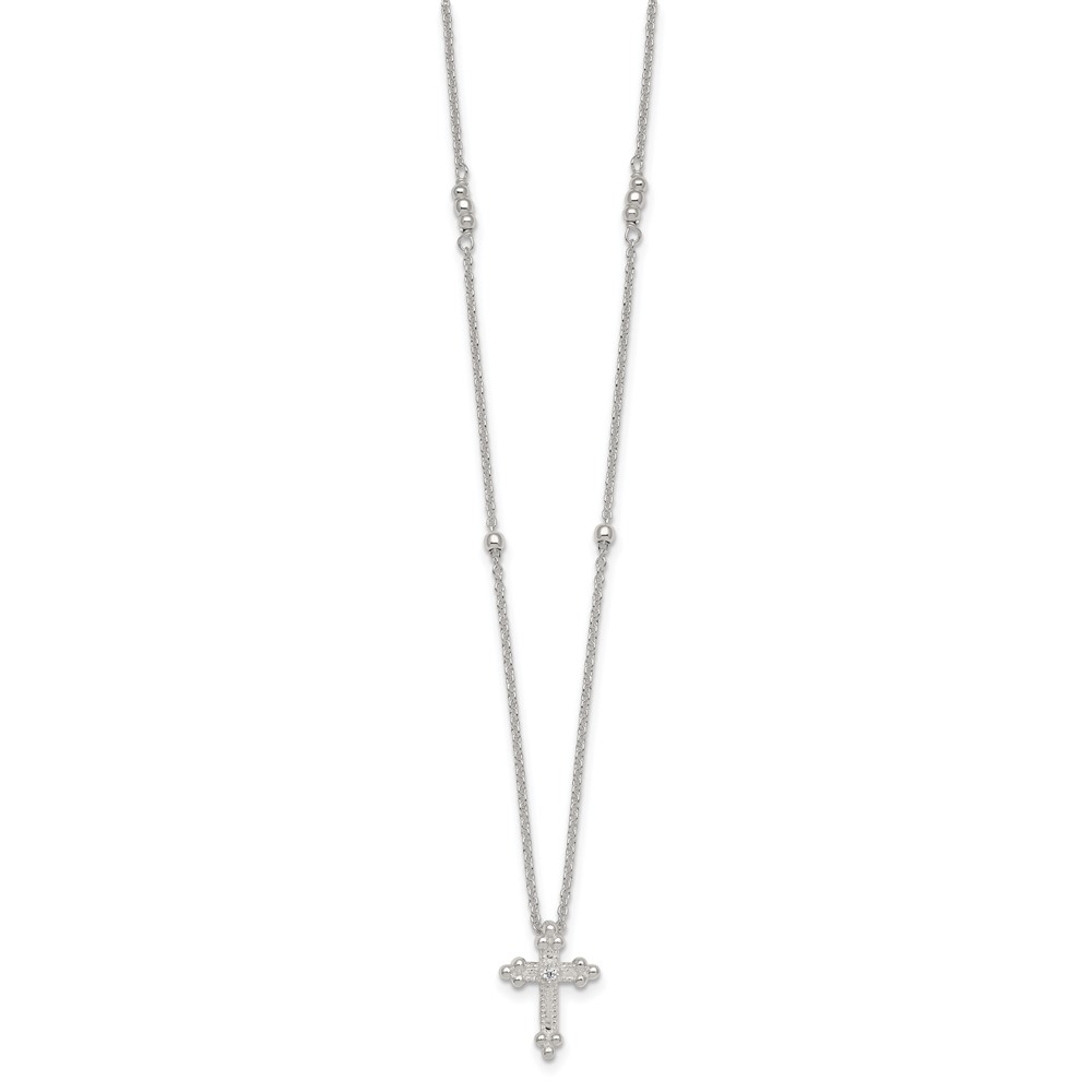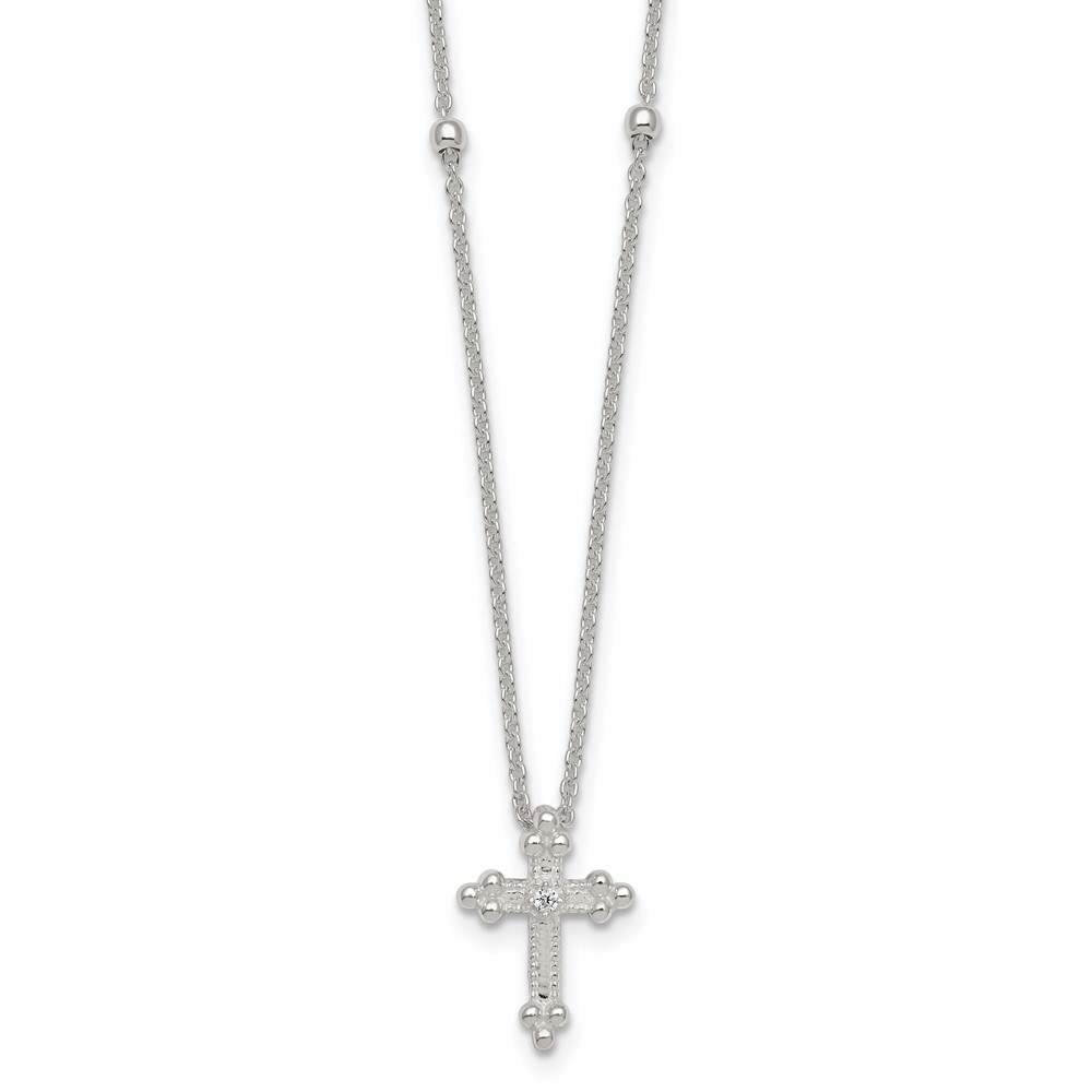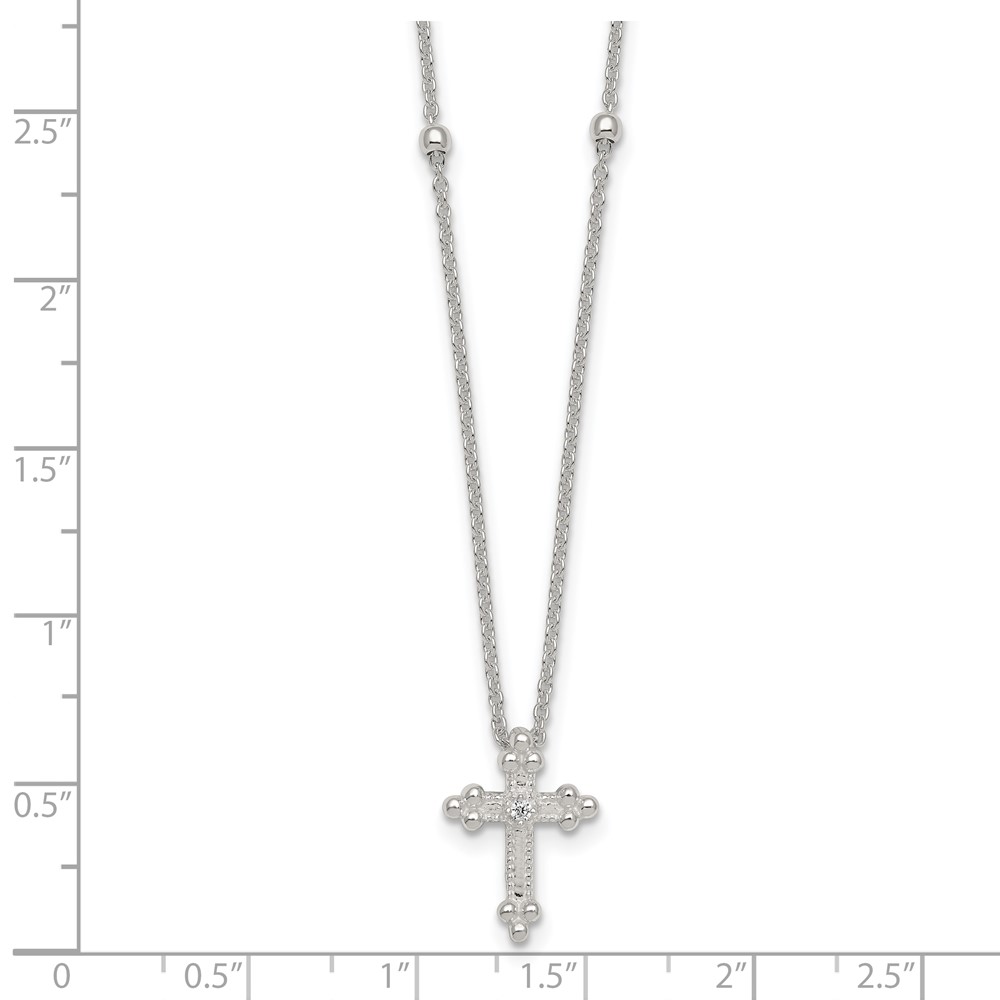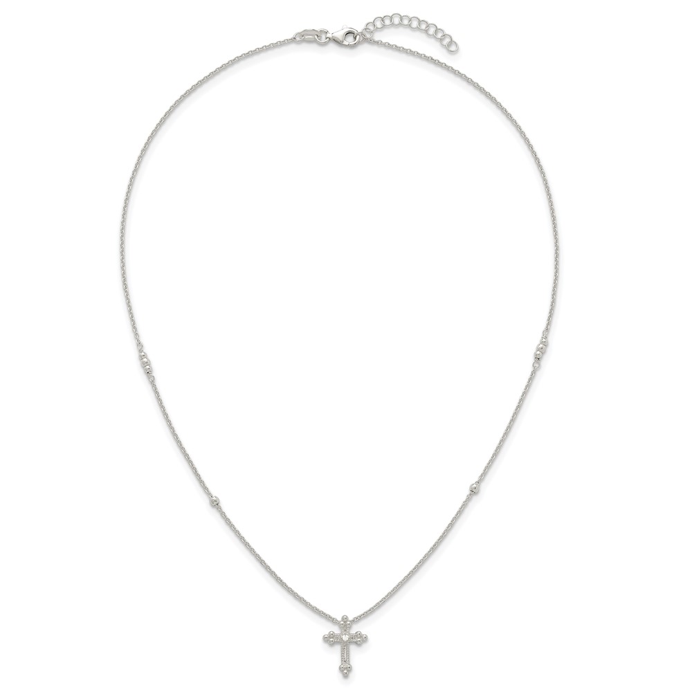 Sterling Silver Polished and Beaded White CZ Budded Cross 16.5 inch with 1 inch Extension Necklace