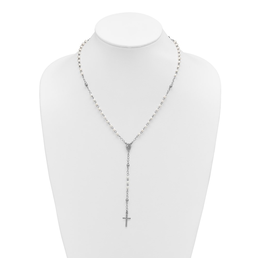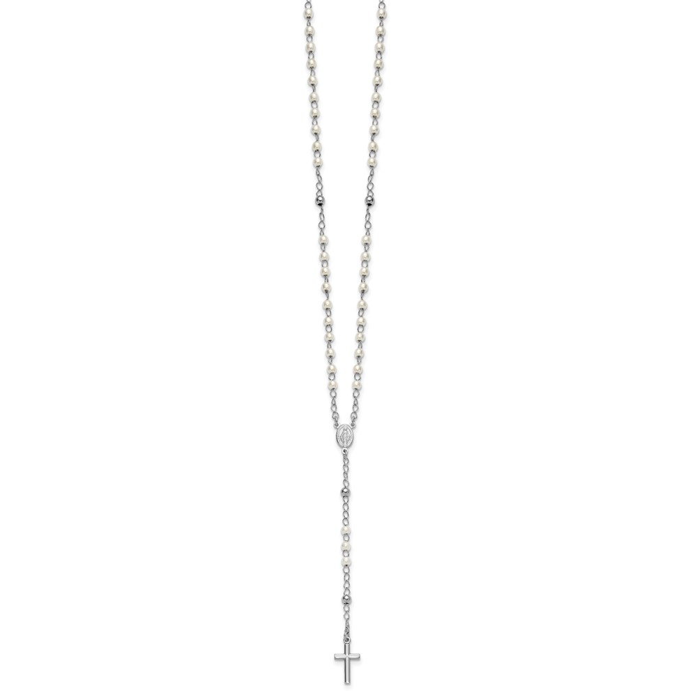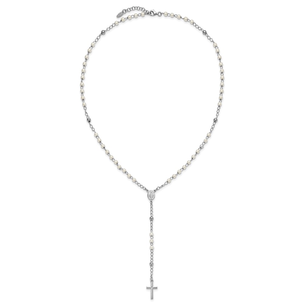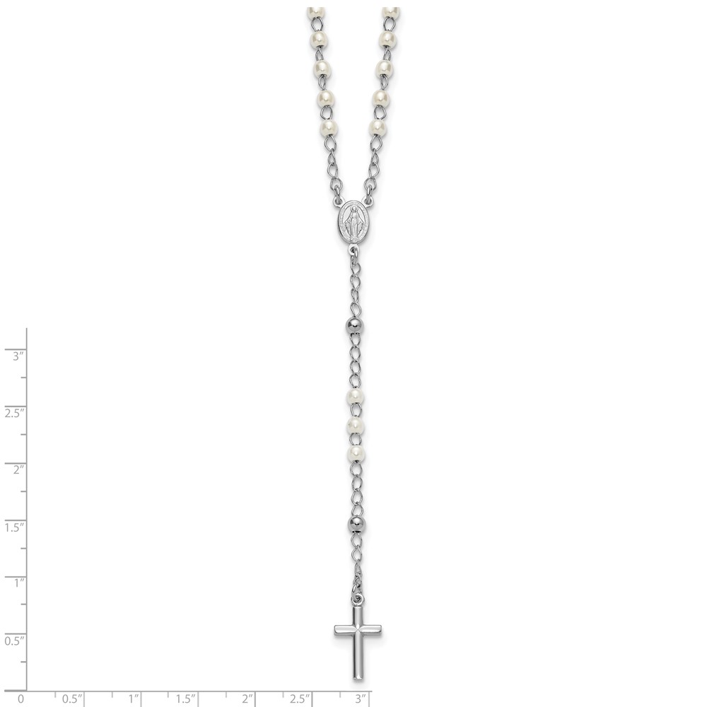Sterling Silver Rhodium-plated Plastic Imitation Pearl 19.75 inch with 1 inch extender Rosary Necklace