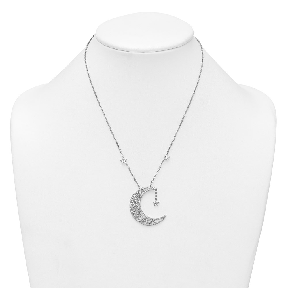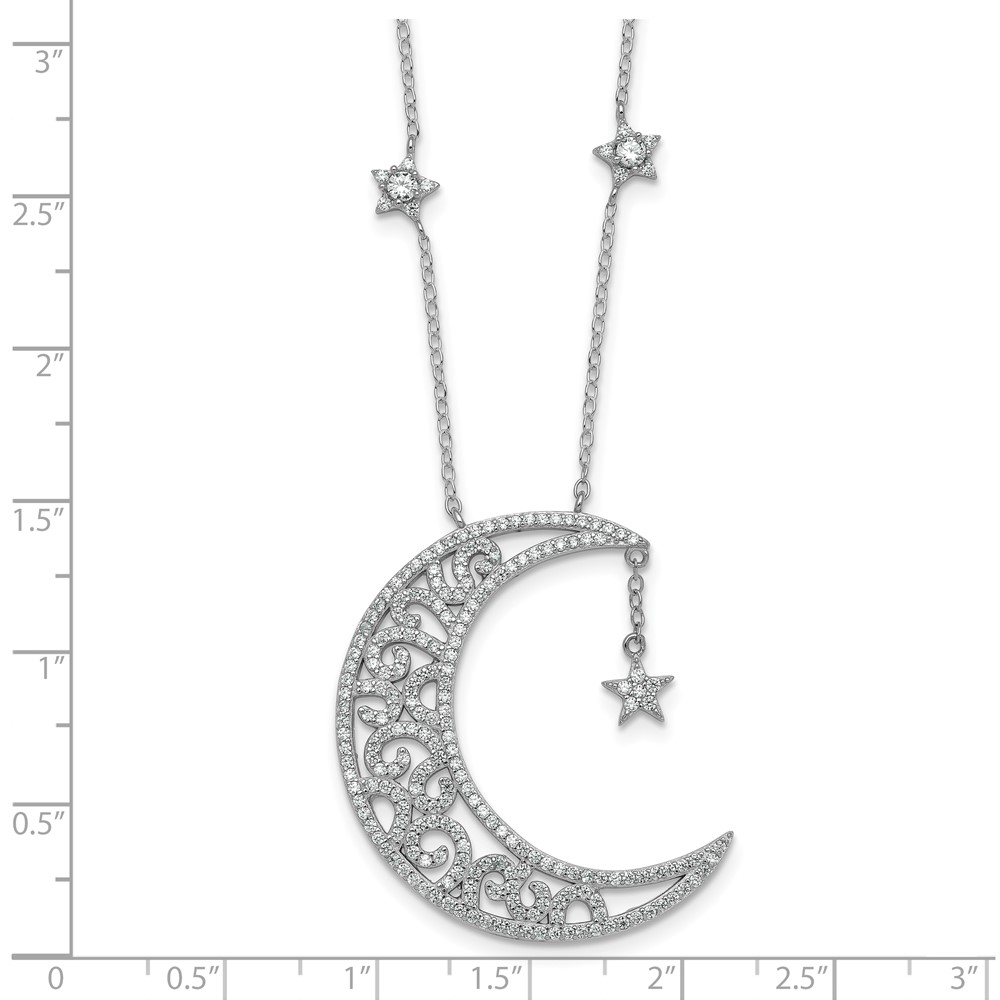 Sterling Silver Rhodium-plated Polished CZ Filigree Moon and Stars 18 Inch Necklace