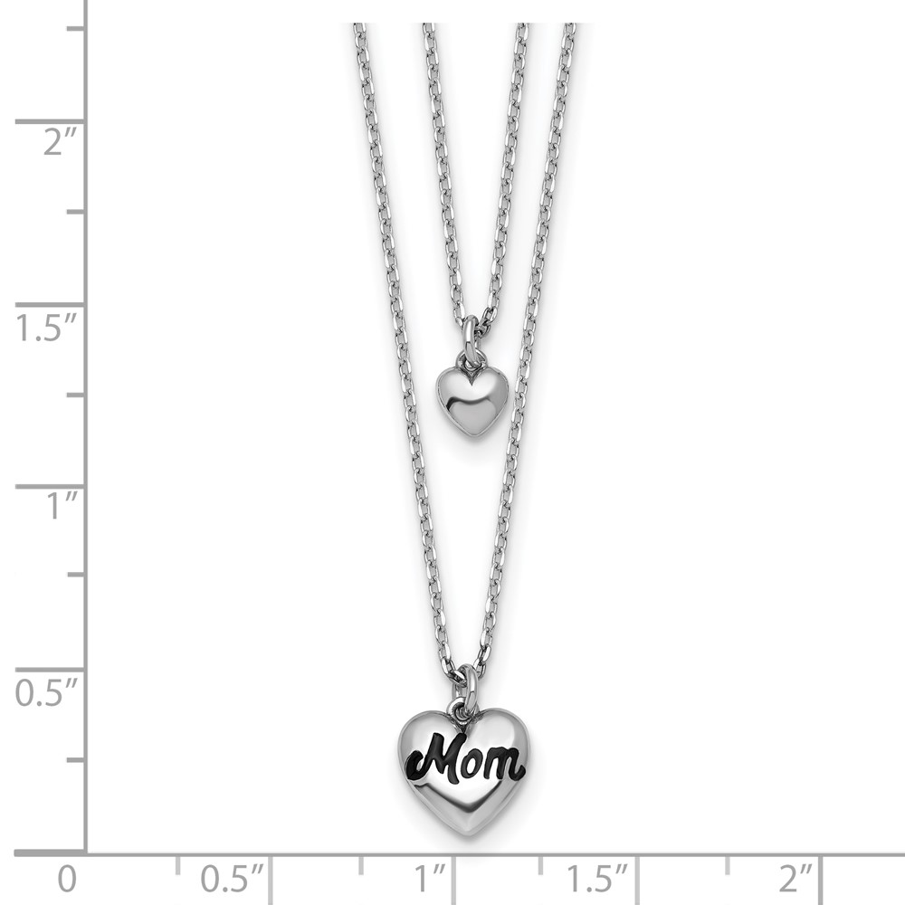 Sterling Silver Rhodium-plated Two-Strand Black Enameled MOM Puffed Heart and Small Heart 16 inch with 1 inch extension Necklace
