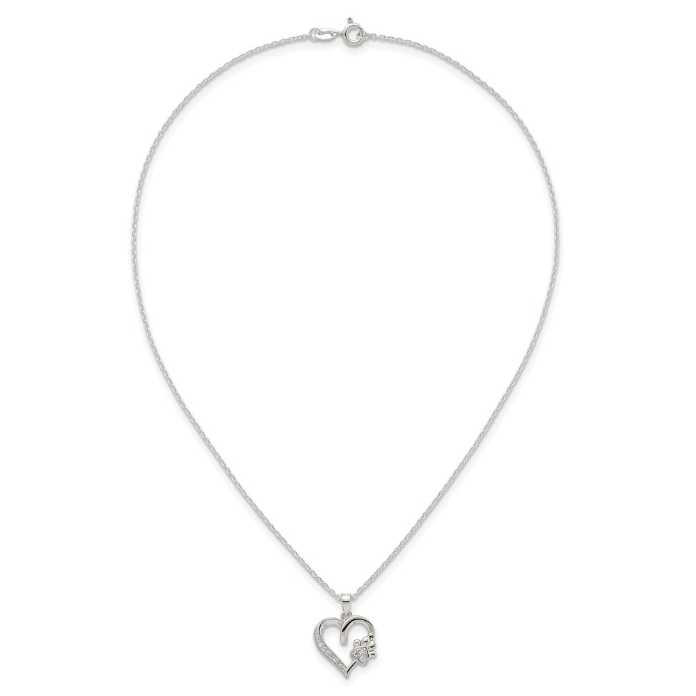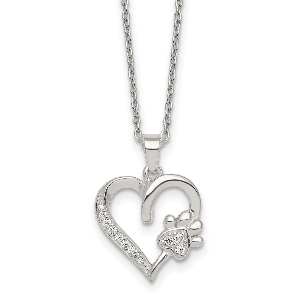 Sterling Silver Polished White CZ Heart and Paw Print 16 inch Necklace