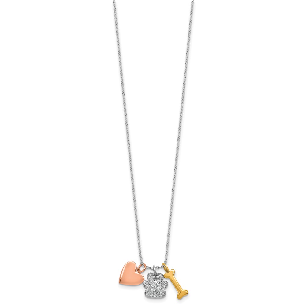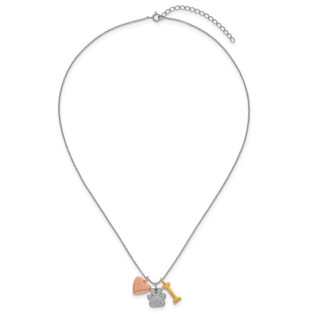 Sterling Silver Rose and Yellow Gold-plated Polished CZ Pawprint Heart and Bone 16 Inch with 2 Inch Extension Necklace