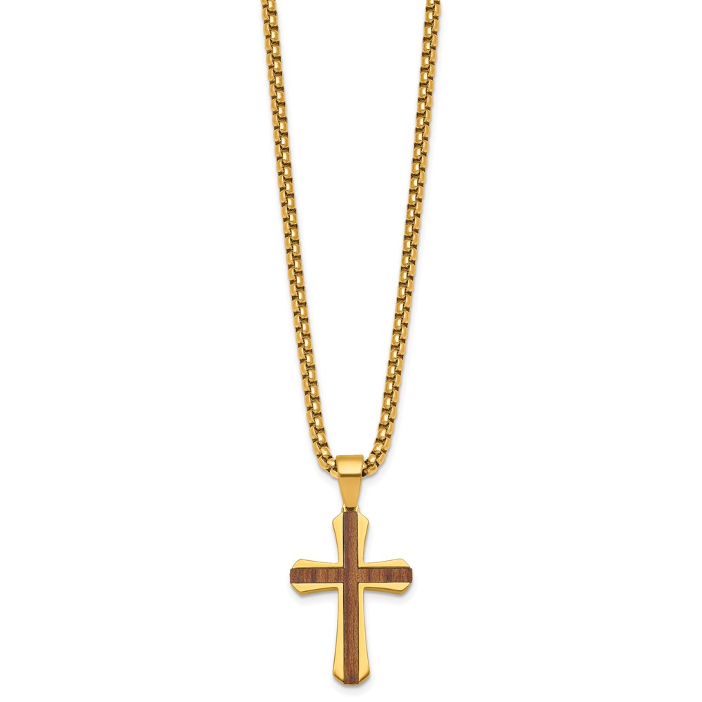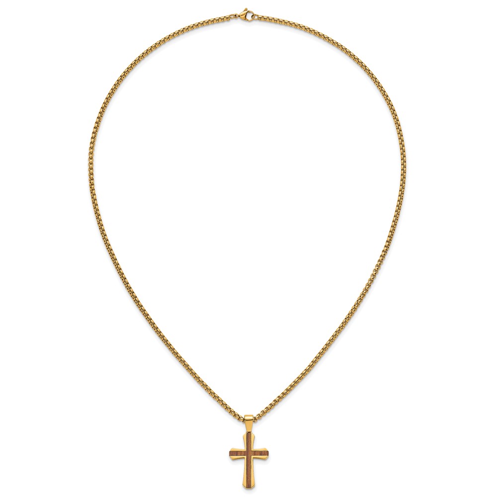 Stainless Steel Polished Yellow IP-plated Wood Inlay Cross 24in Necklace