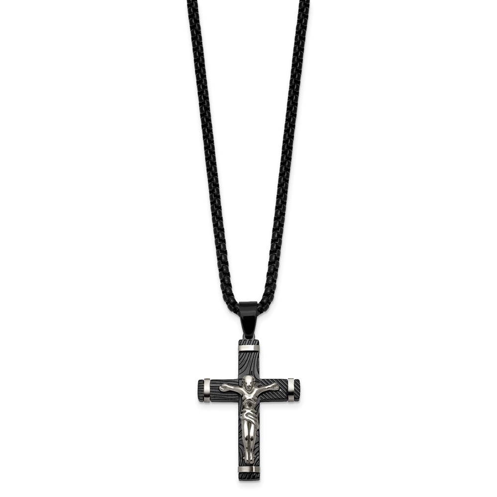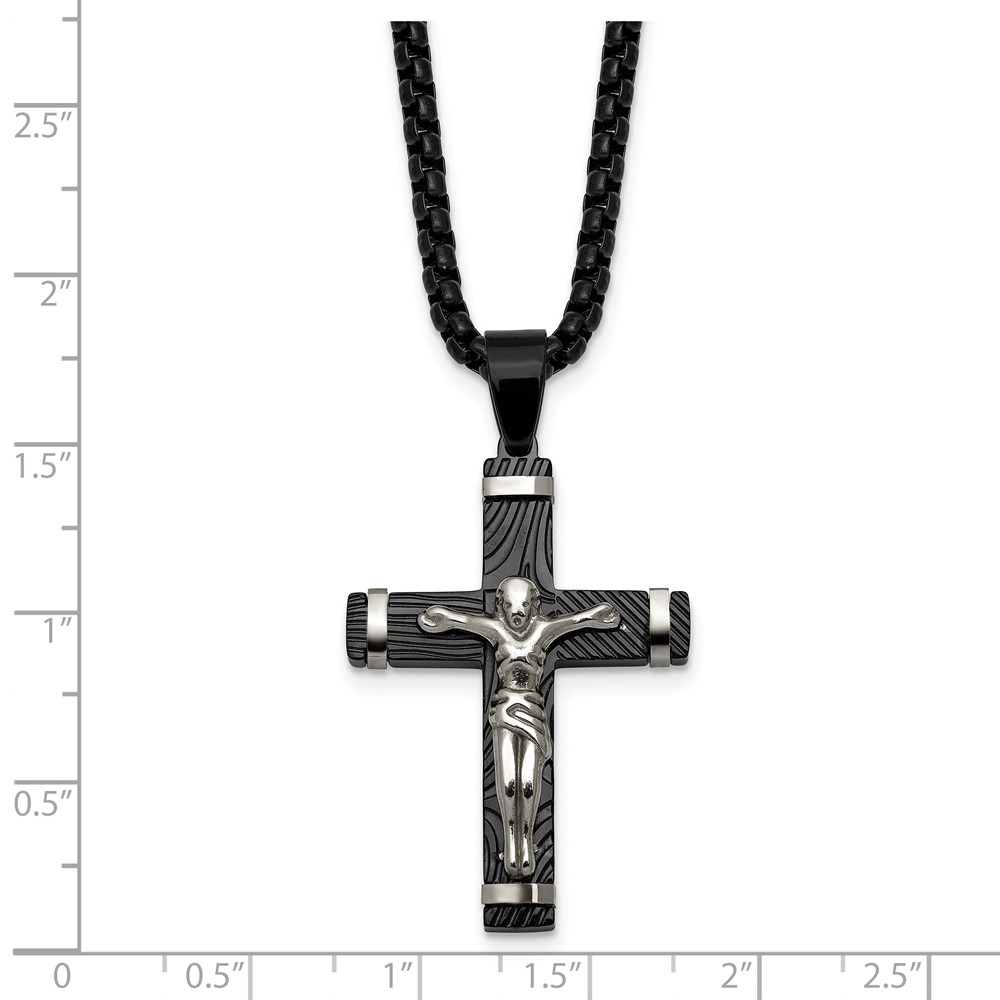 Stainless Steel Polished Black IP-plated Textured Crucifix 24in Necklace