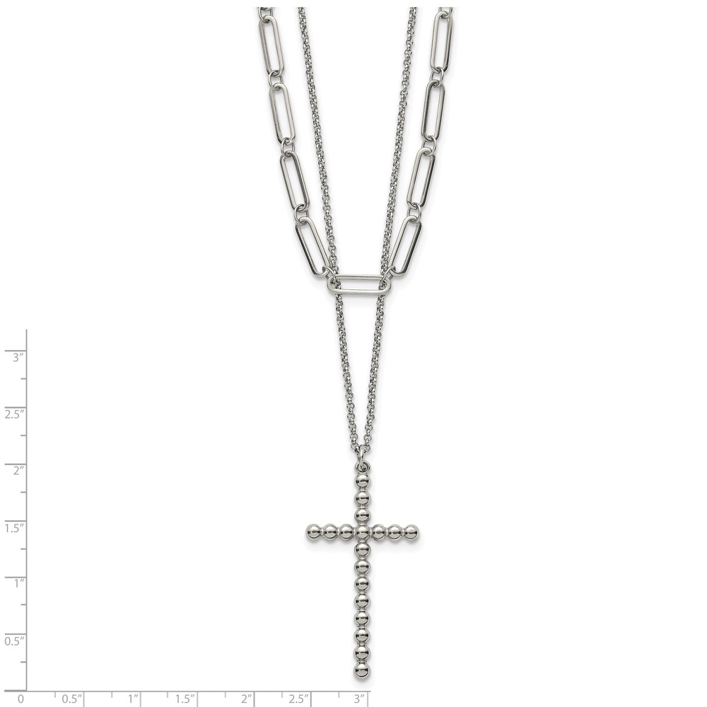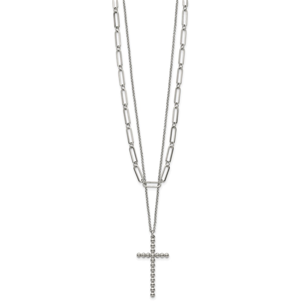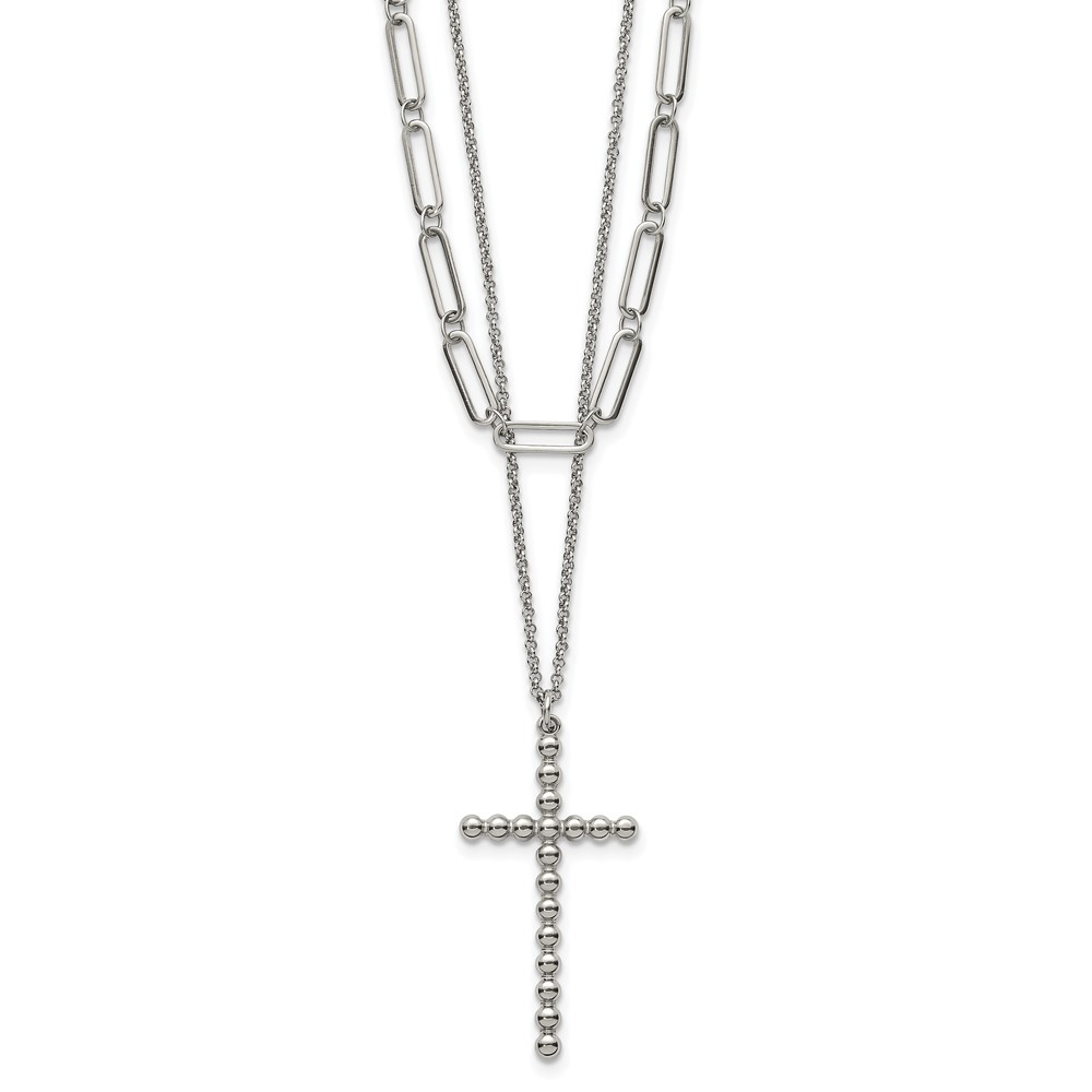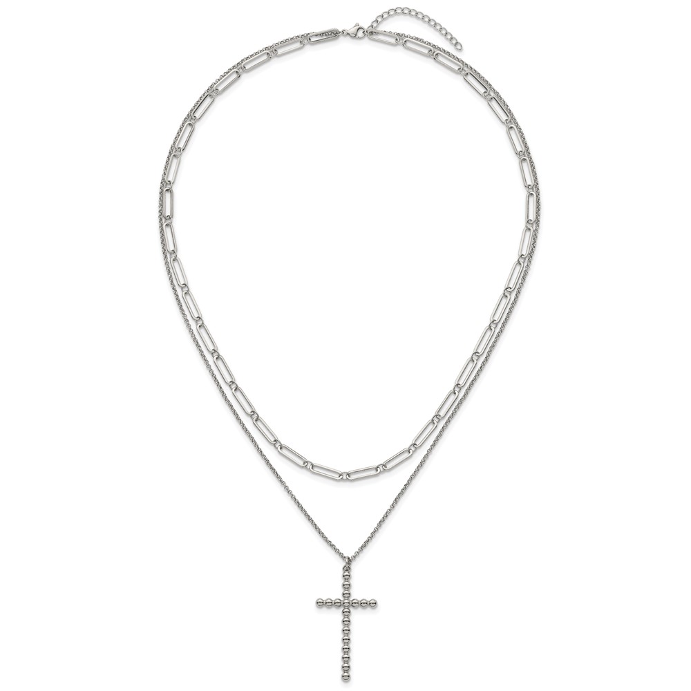 Stainless Steel Polished Beaded Cross 2-Strand 22in w/1.75in ext. Necklace