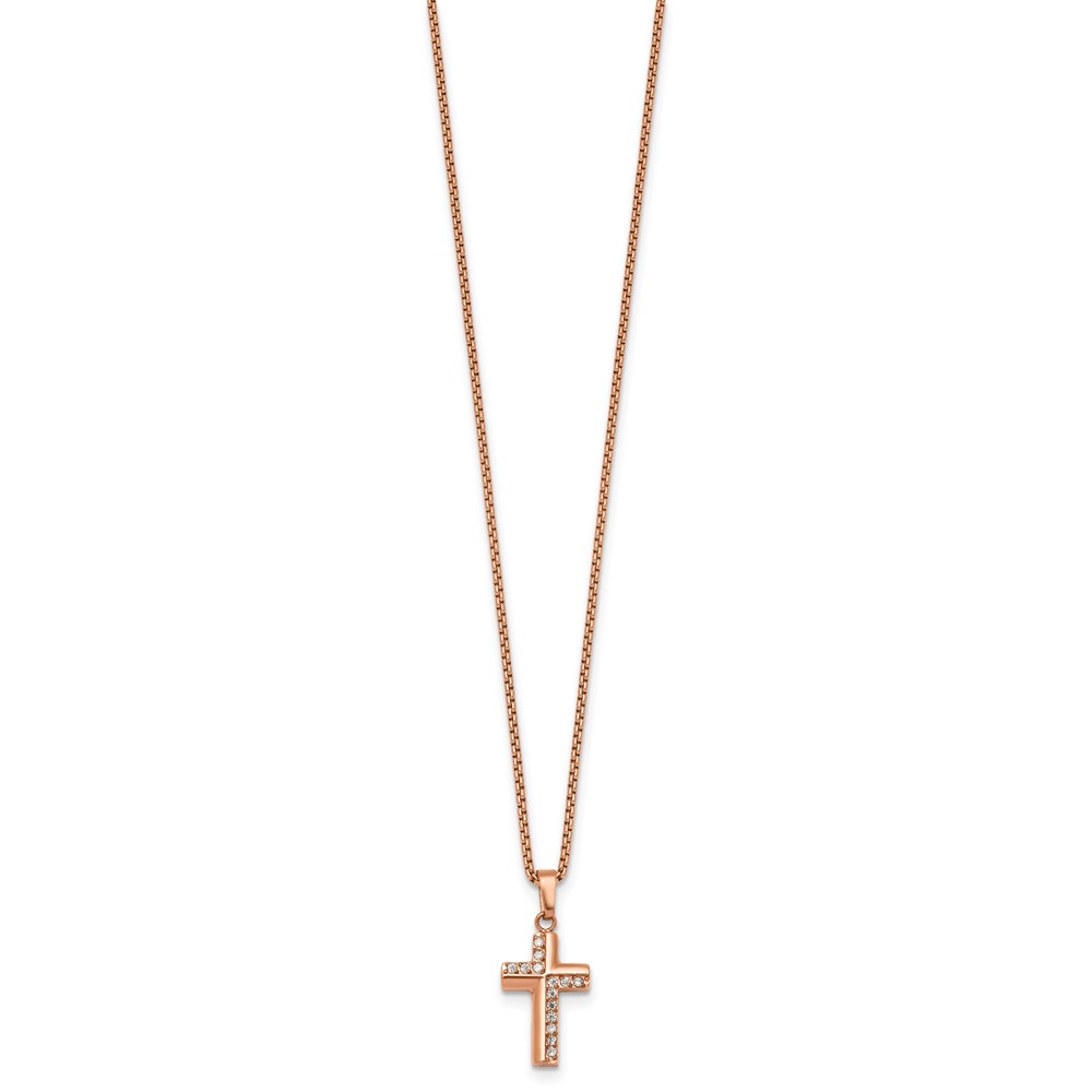 Stainless Steel Polished Rose IP CZ Cross 18in with1.75in ext. Necklace