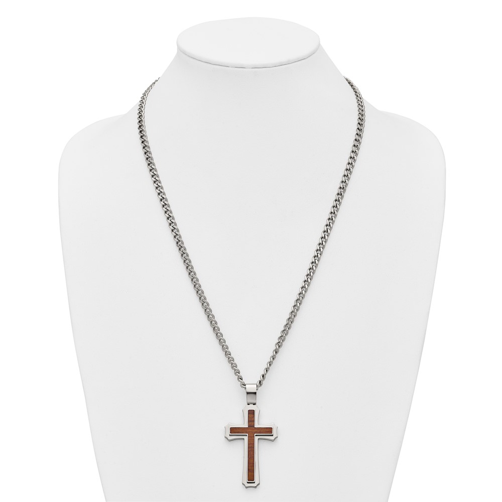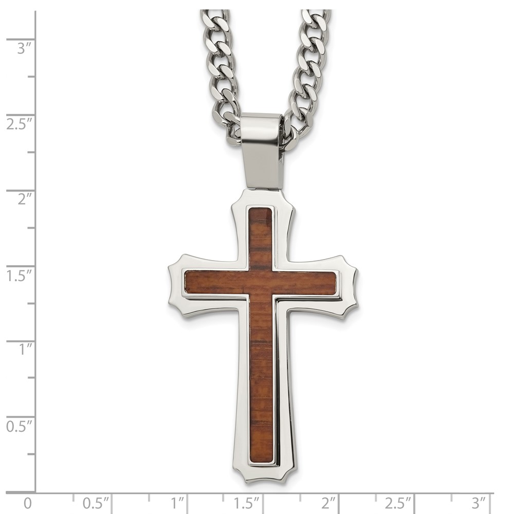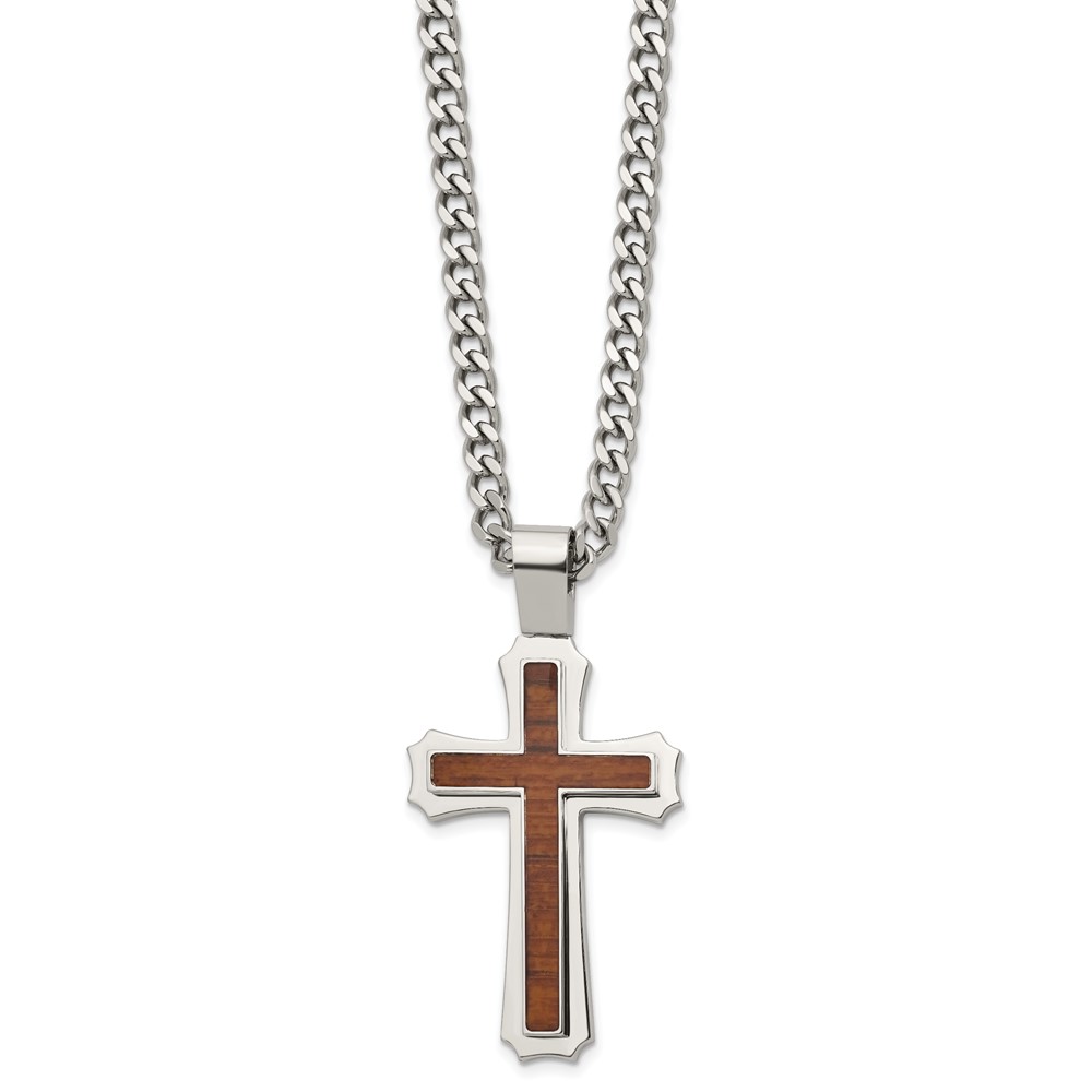Stainless Steel Polished w/Wood Inlay Cross 24in w/2.5in ext. Necklace