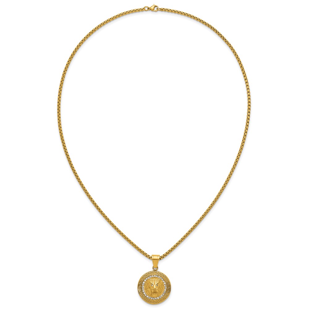 Stainless Steel Polished Yellow IP Lion on Greek Key Crystal Back Necklace