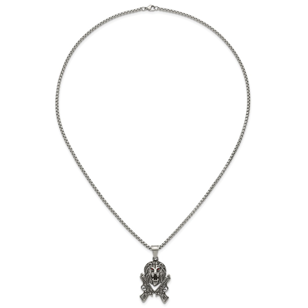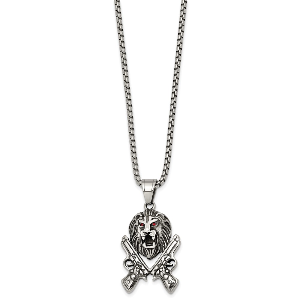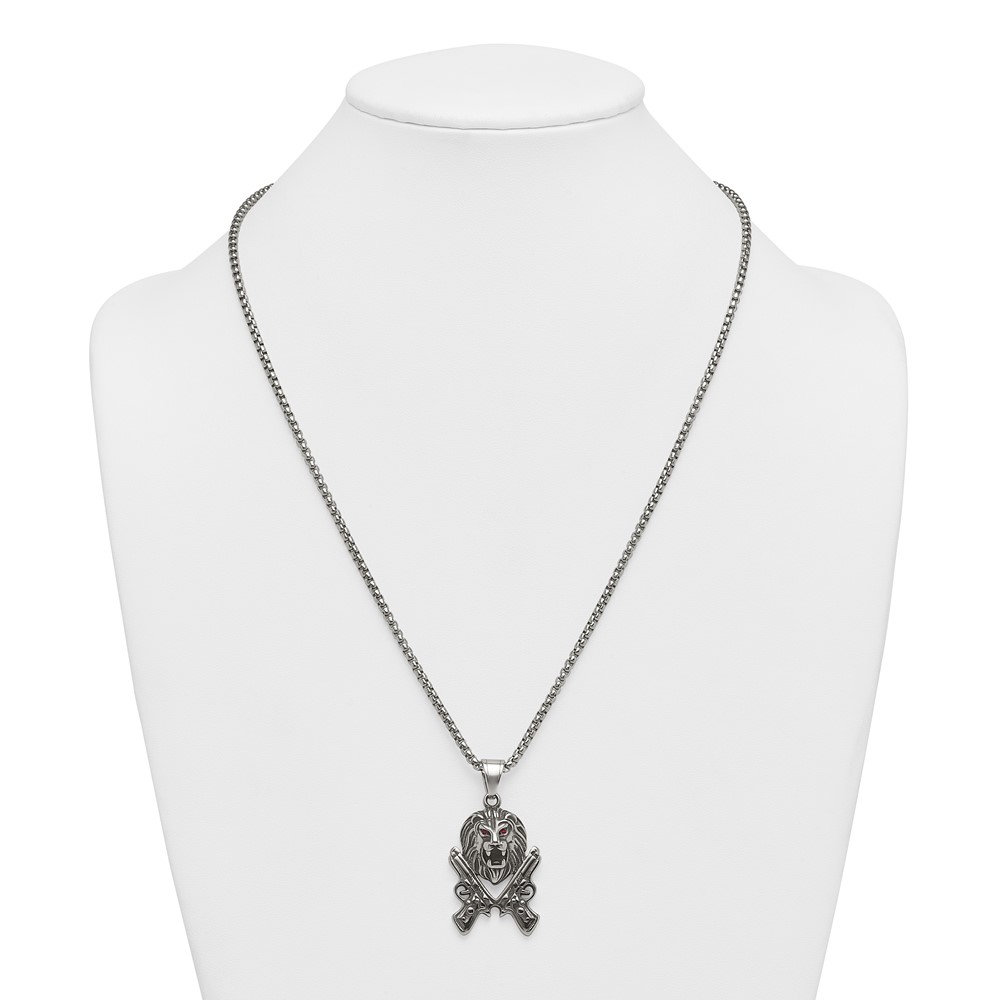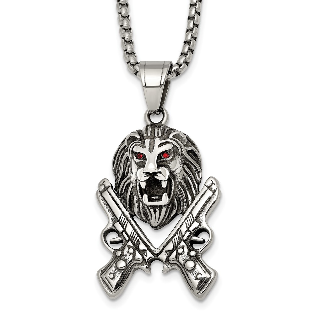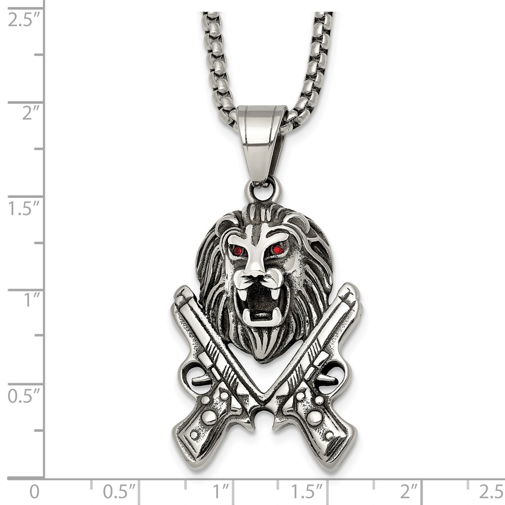 Stainless Steel Antiqued Polished Red Crystal Lion Head & Pistols Necklace