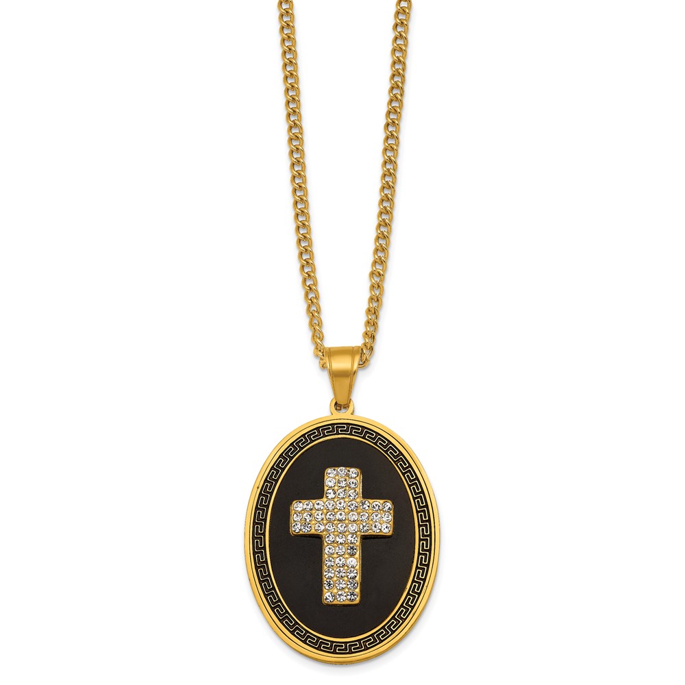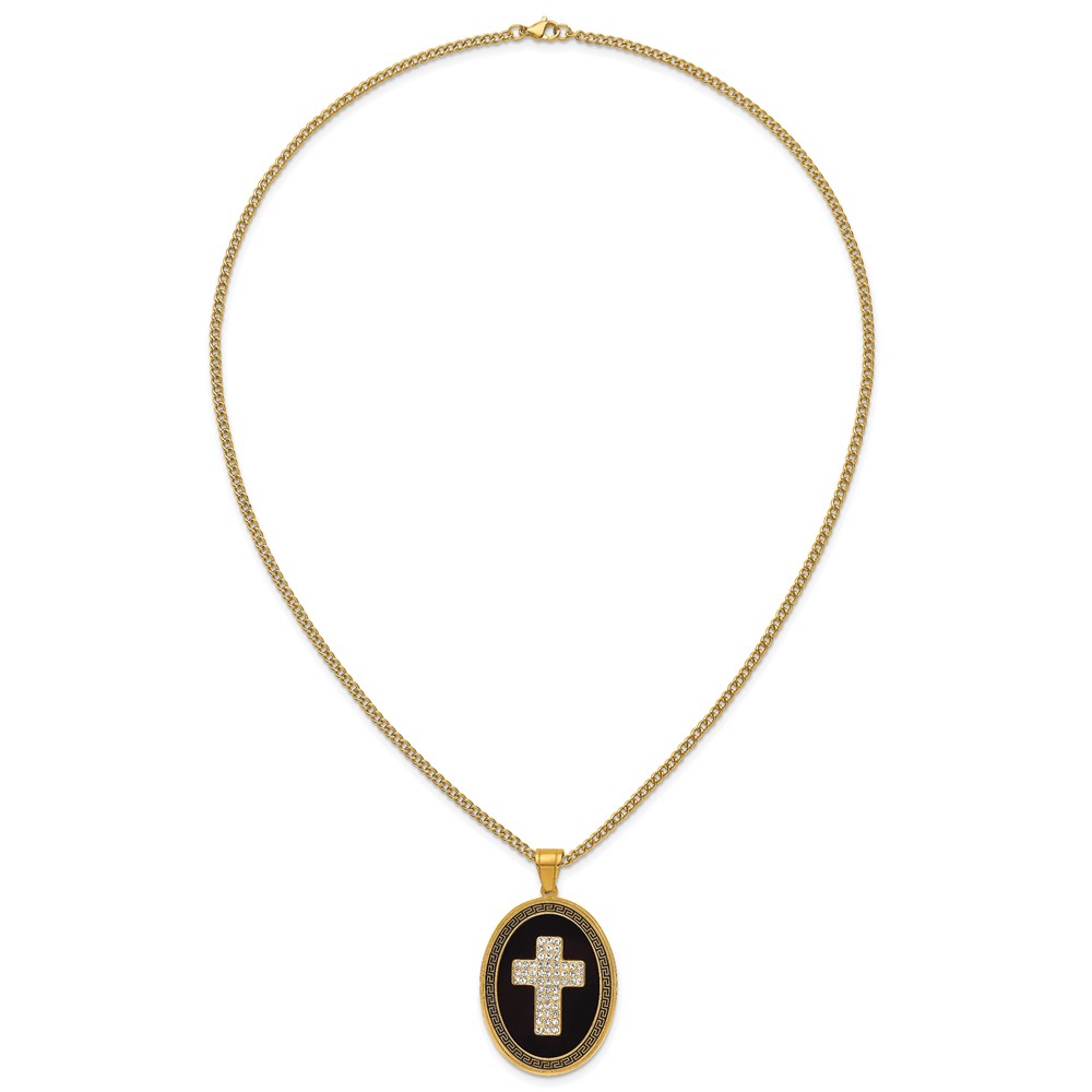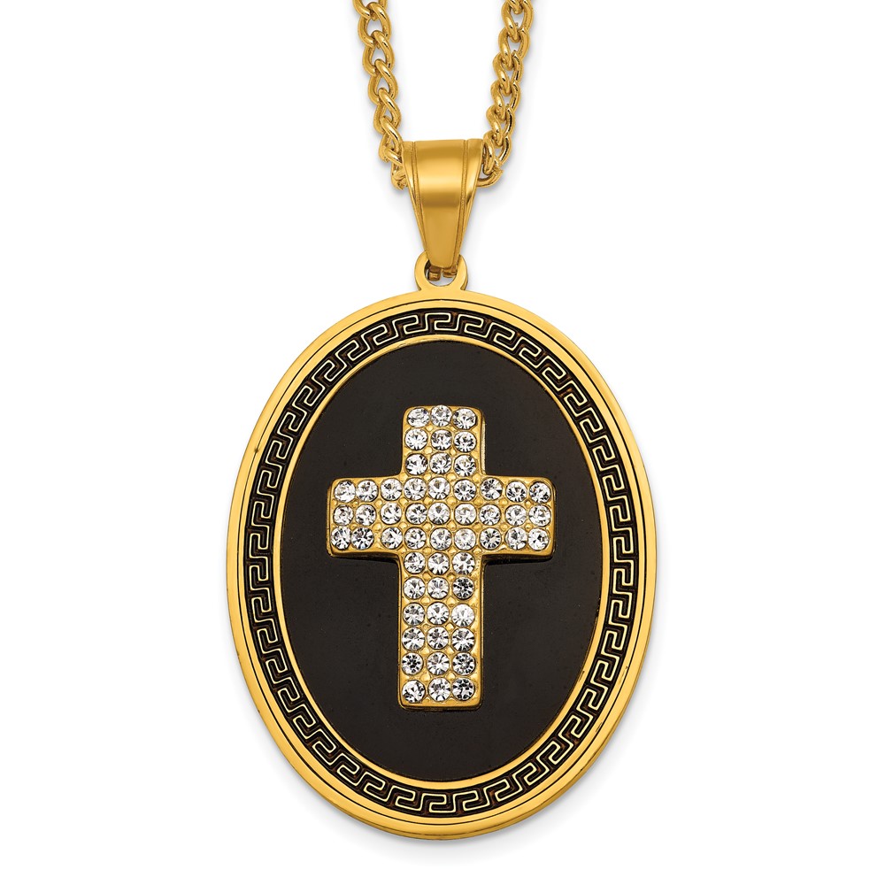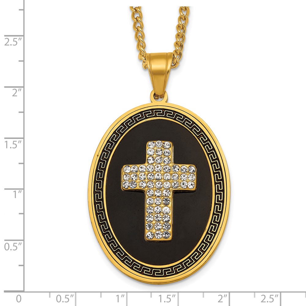 Stainless Steel Polished Yellow IP/Blk Enamel Crystal Oval Cross Necklace
