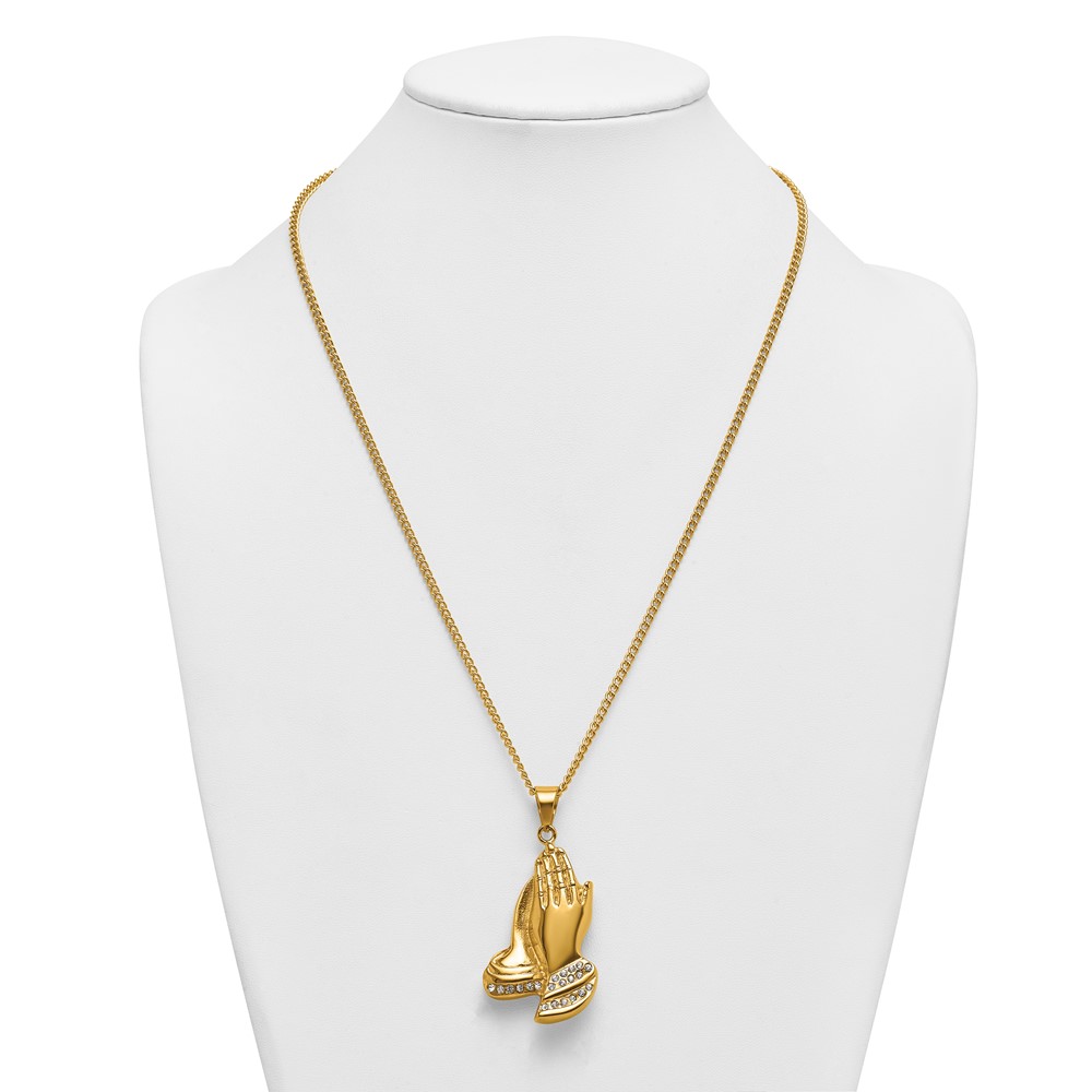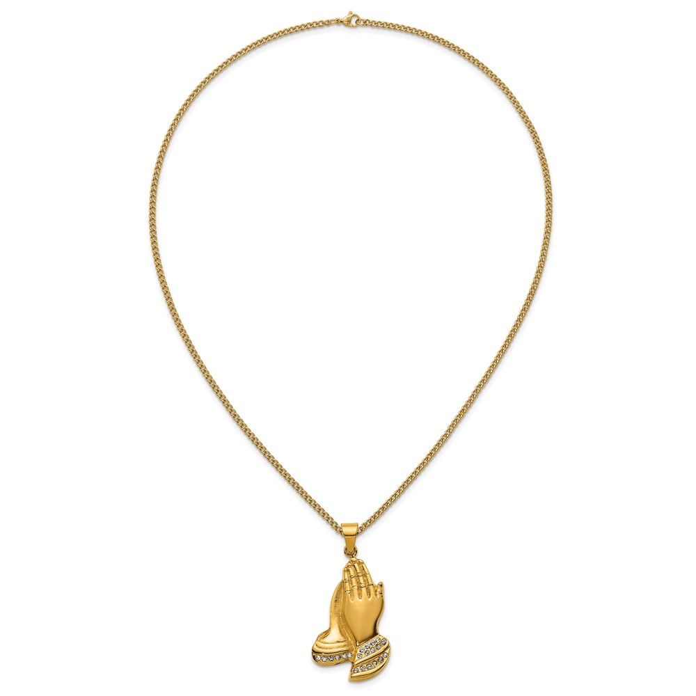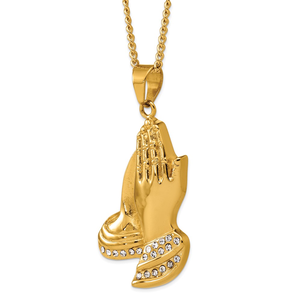Stainless Steel Polished Yellow IP Crystal Prayer Hands 24in Necklace
