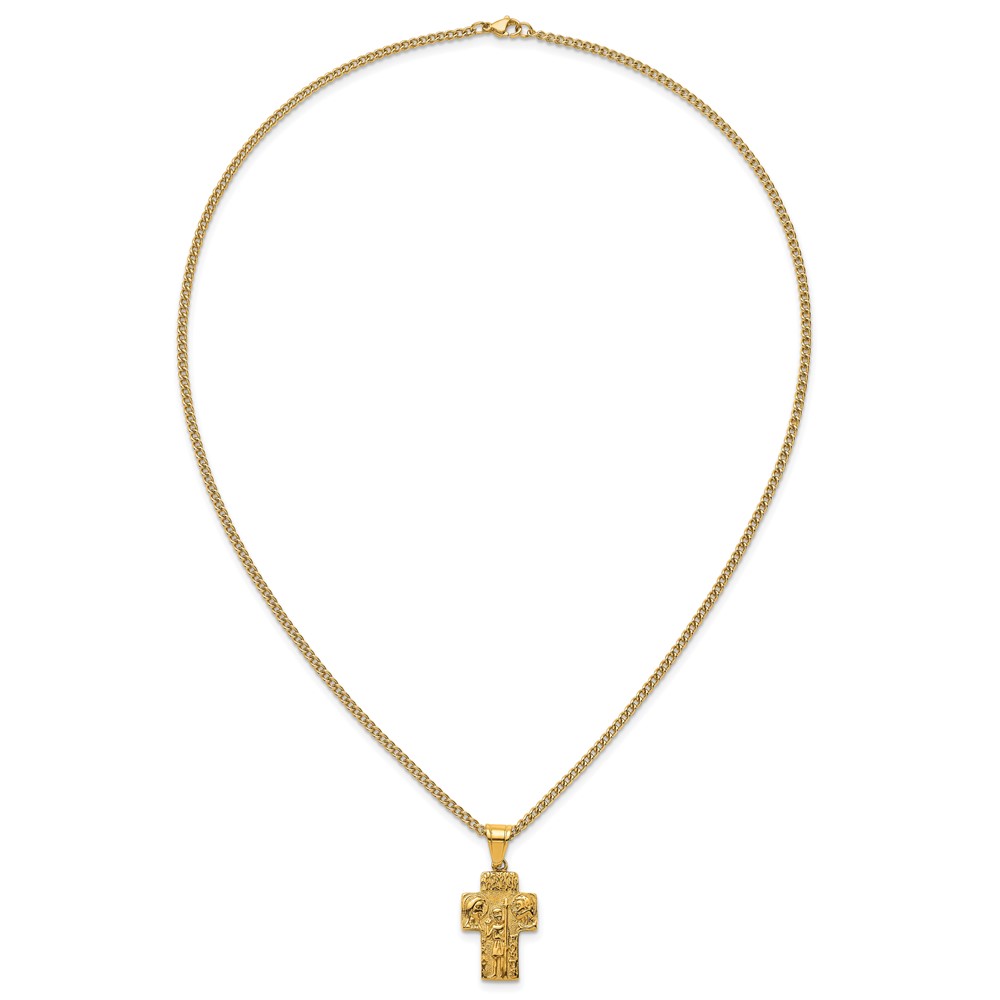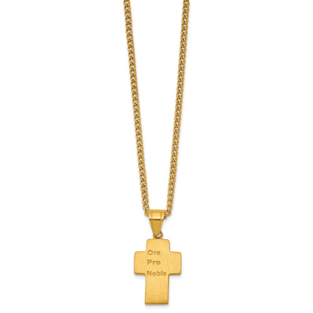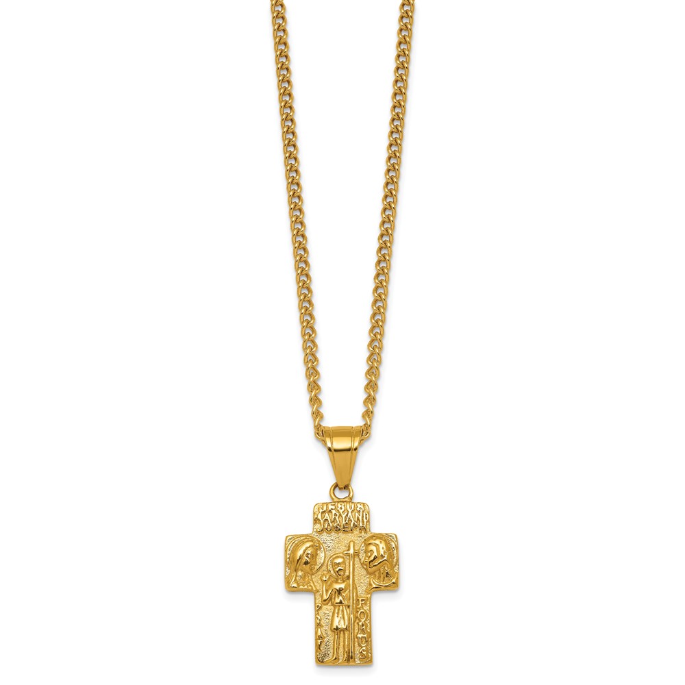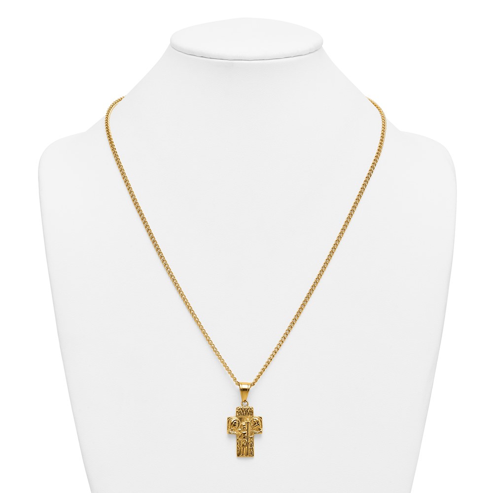 Stainless Steel Polished Yellow IP Jesus Mary Joseph Cross Necklace
