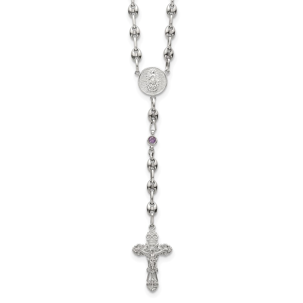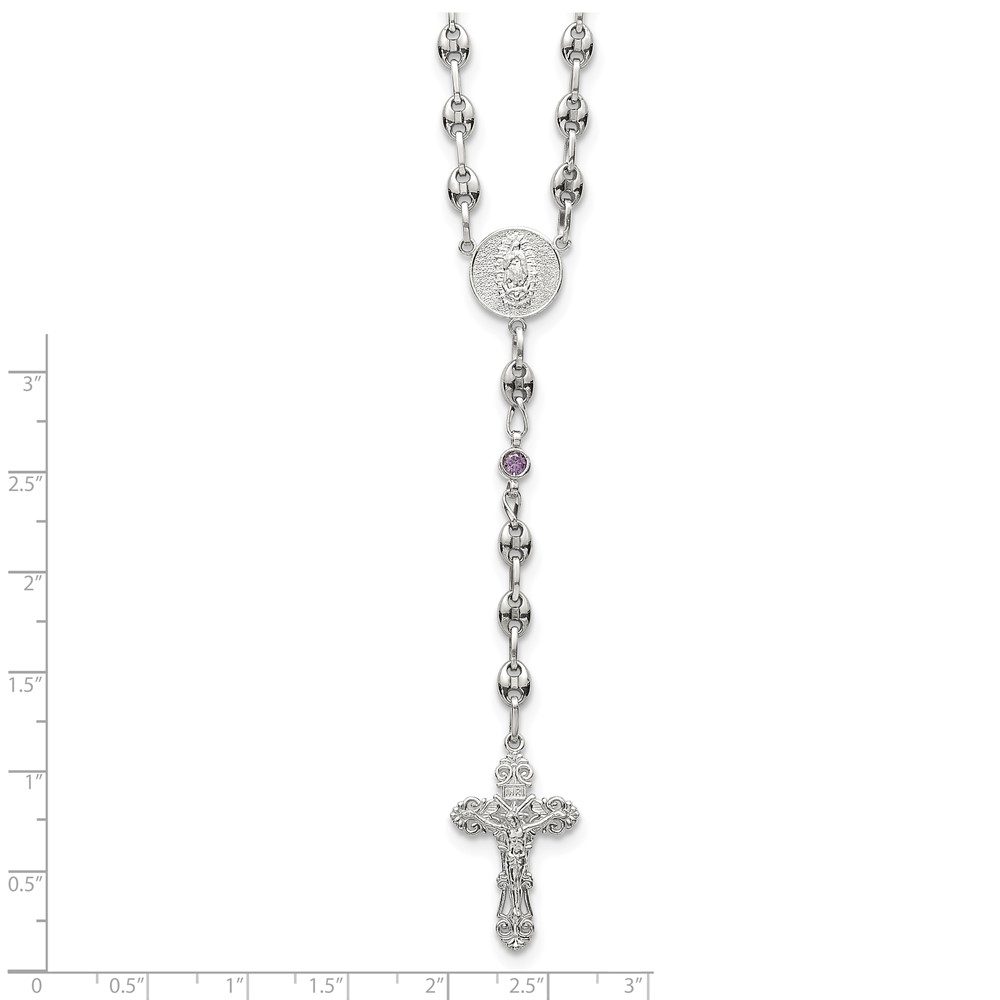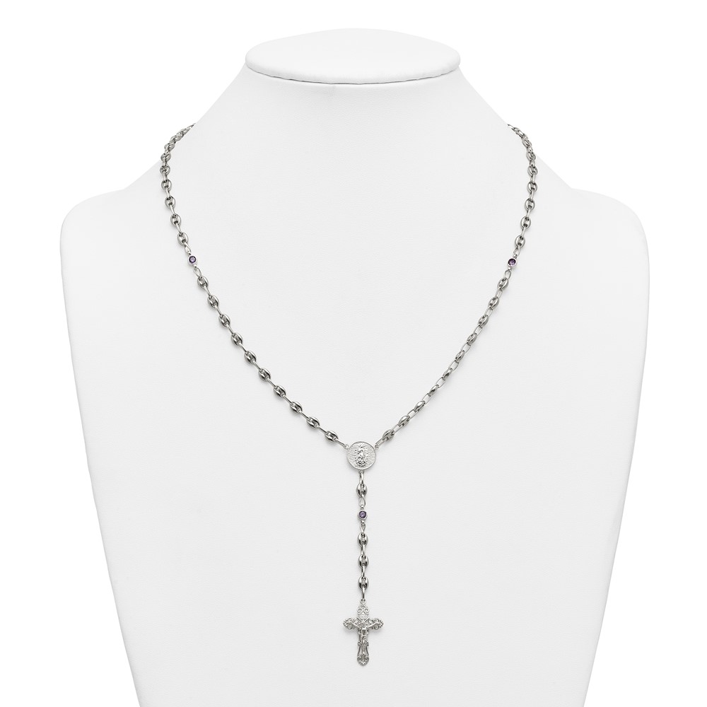Stainless Steel with 925 Polished Purple CZ 21in Rosary Necklace