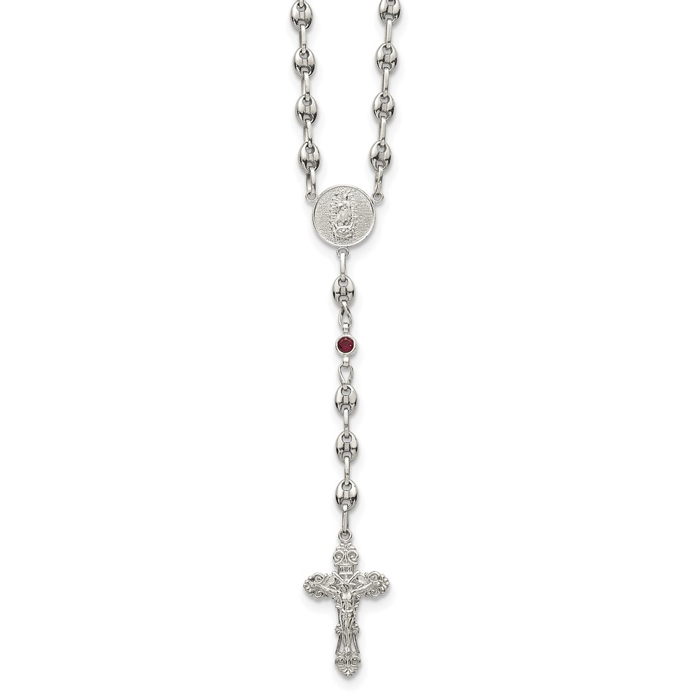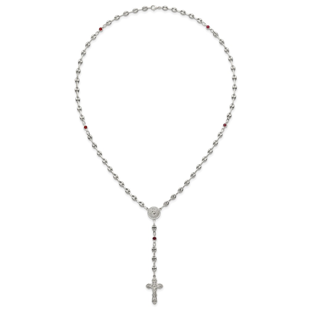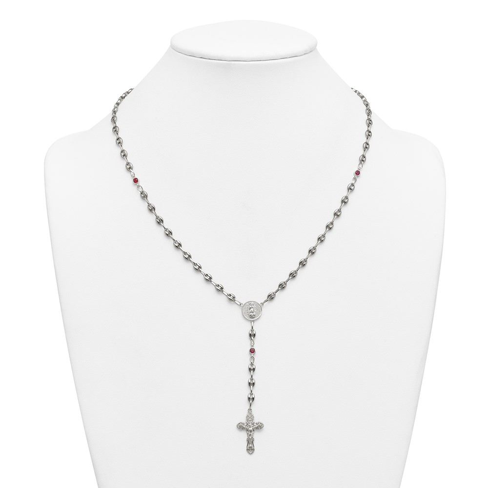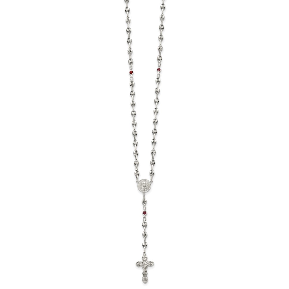 Stainless Steel with 925 Polished Dark Red CZ 21in Rosary Necklace