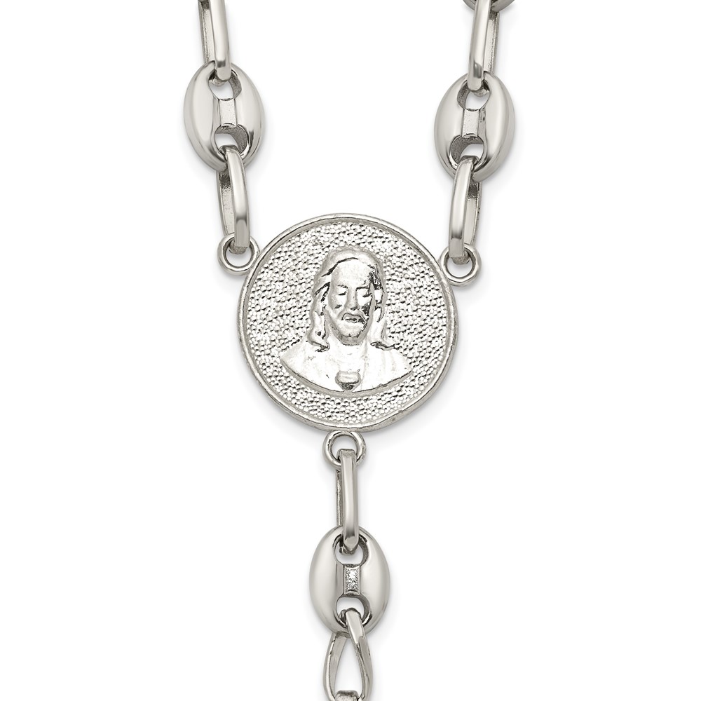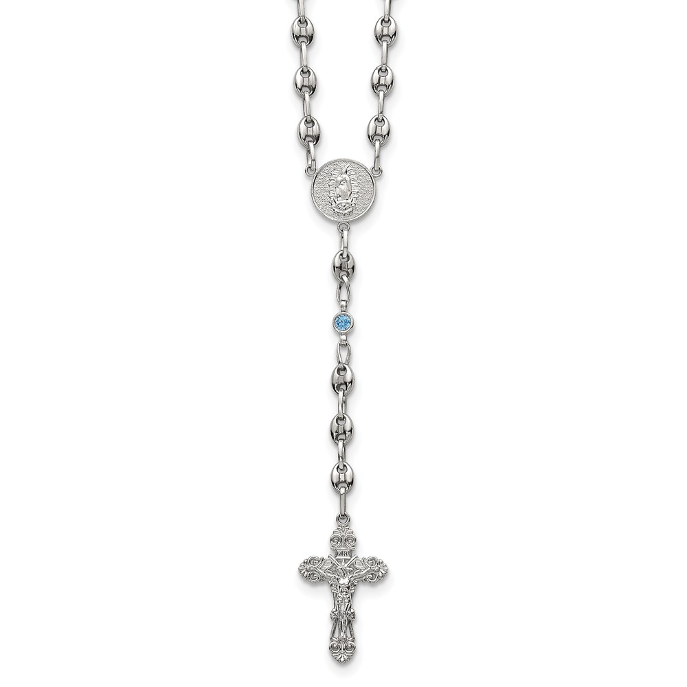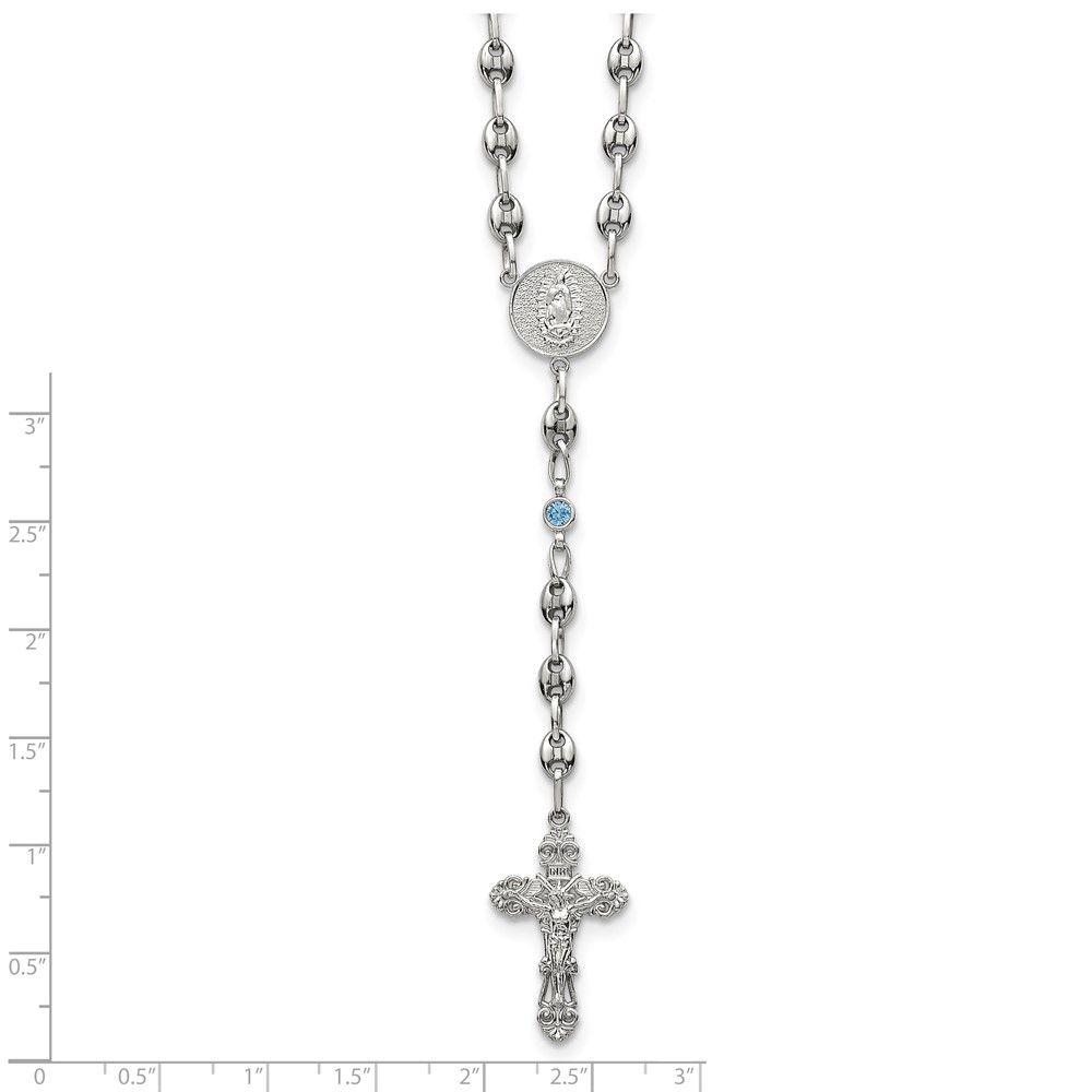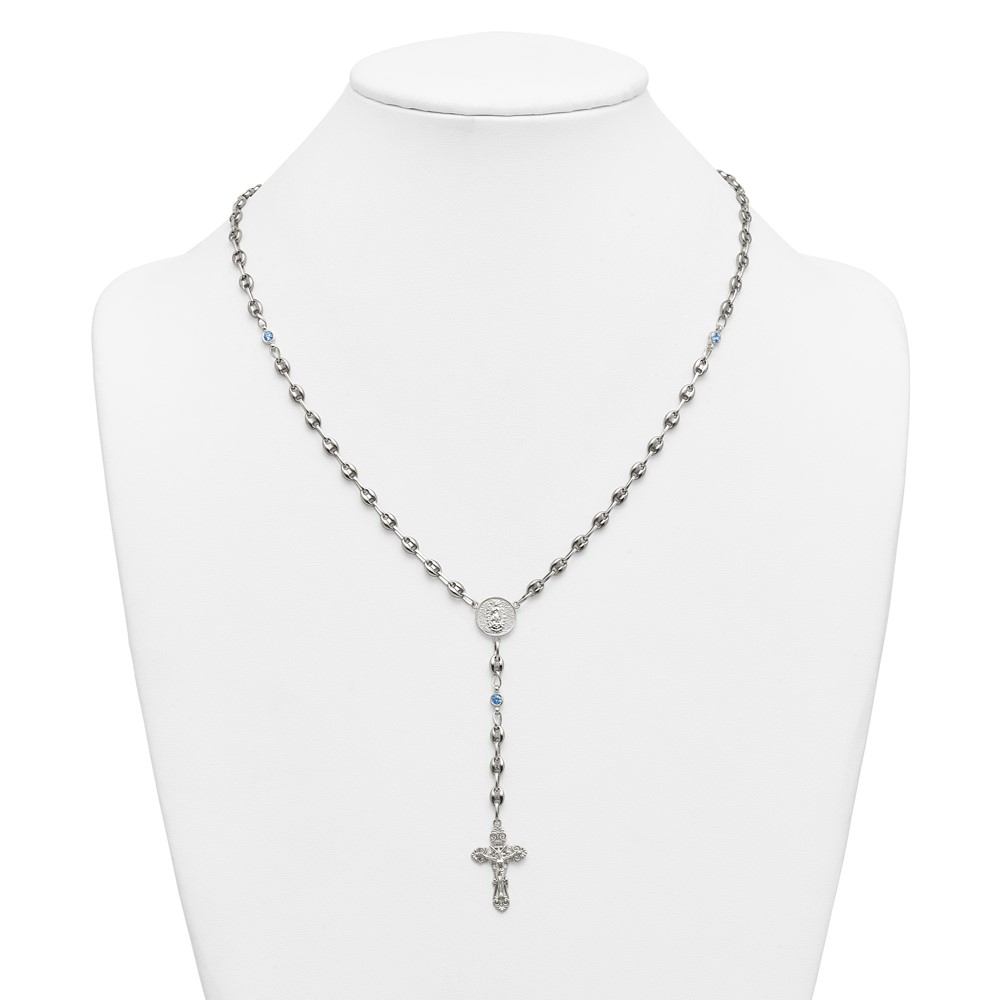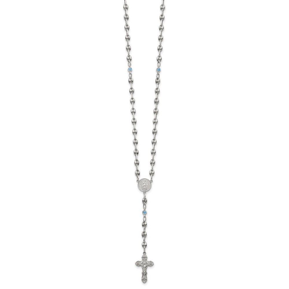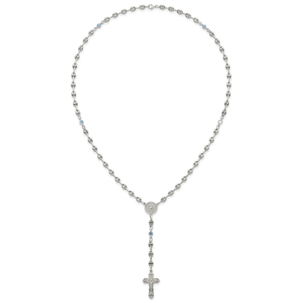 Stainless Steel with 925 Polished Blue CZ 21in Rosary Necklace