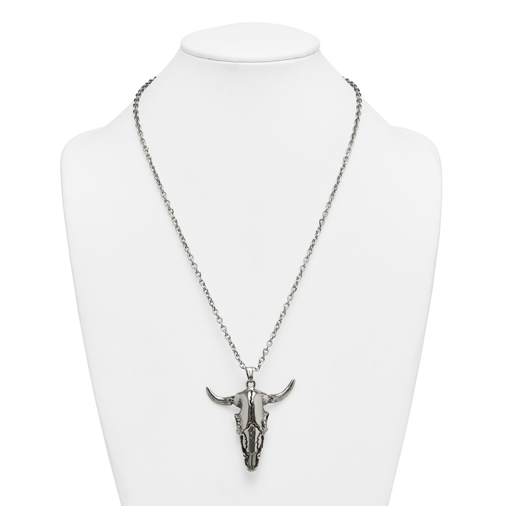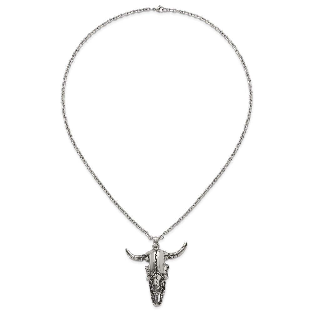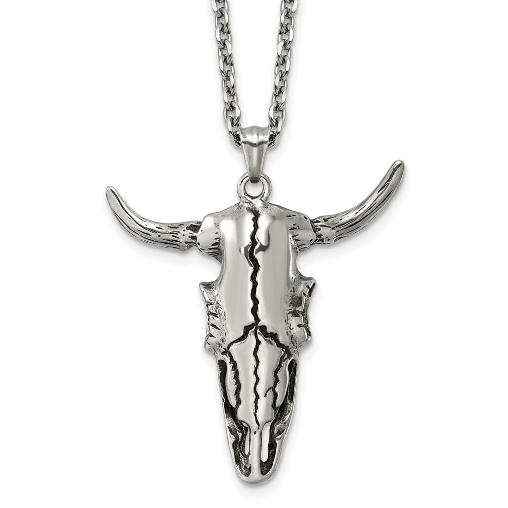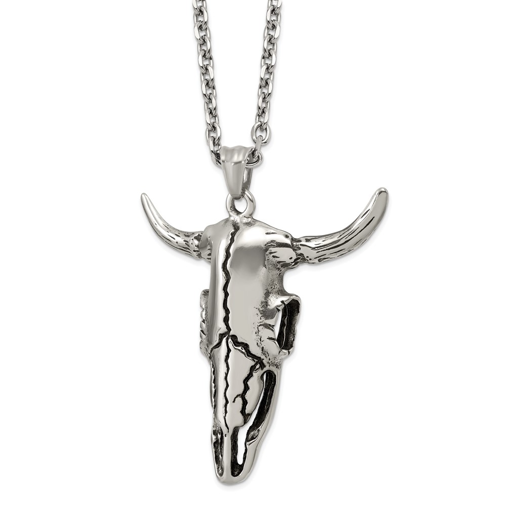 Stainless Steel Antiqued and Polished Bull Skull 24in Necklace