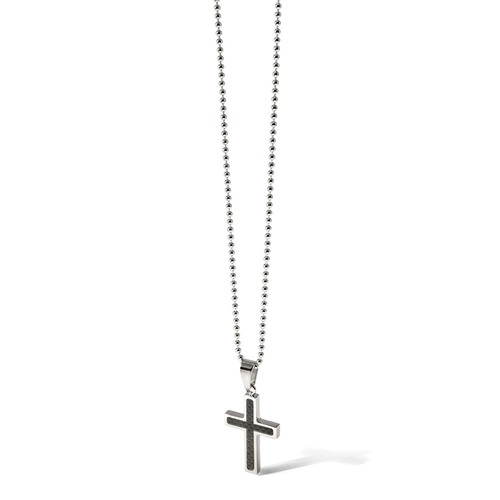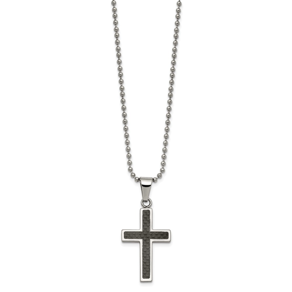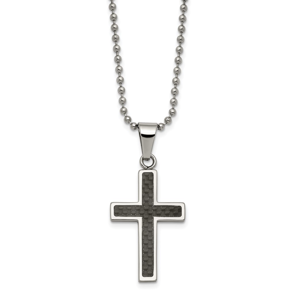 Chisel Stainless Steel Polished with Black Carbon Fiber Inlay Cross Pendant on a 22 inch Ball Chain Necklace