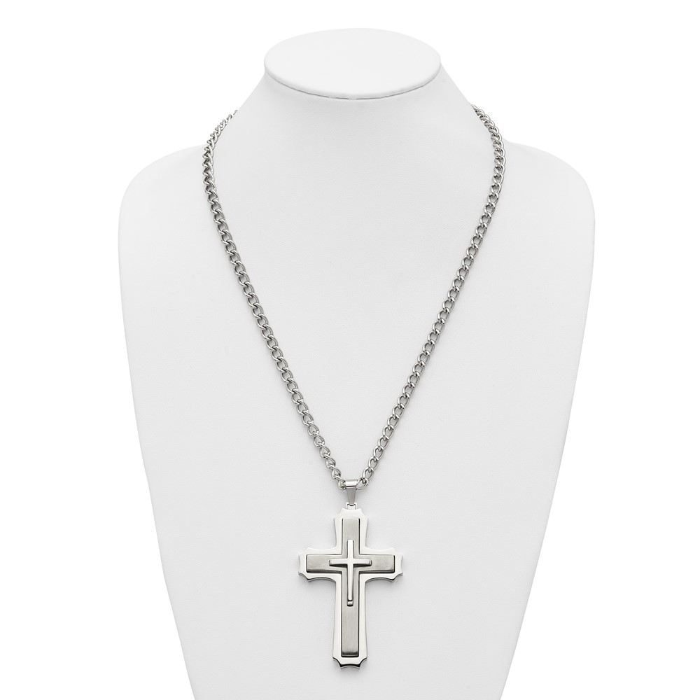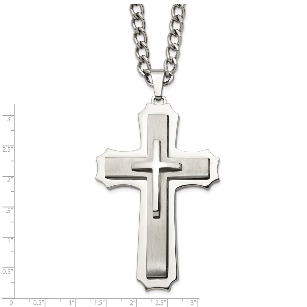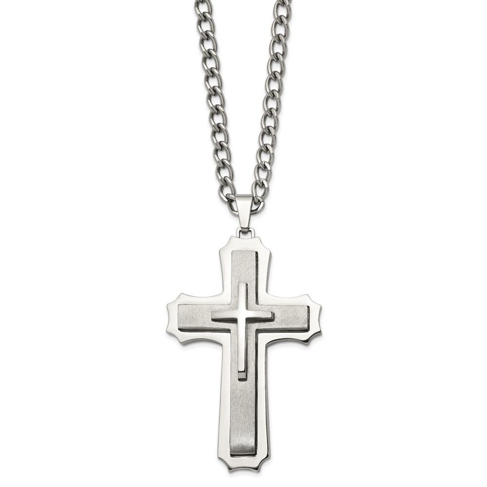 Chisel Stainless Steel Brushed and Polished Large Cross Pendant on a 24 inch Curb Chain Necklace