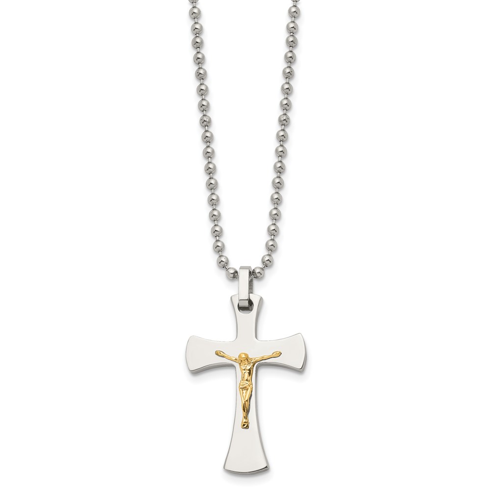 Chisel Stainless Steel Polished with 14k Gold Accent Crucifix Pendant on a 22 inch Ball Chain Necklace